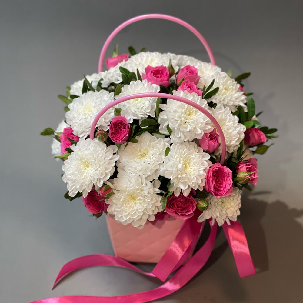Bush rose - 2 pcs Bush chrysanthemum - 2 pcs Handbag - 1 pcs Pistachio bunch - 1 pcs Floral oasis - 1 pcs