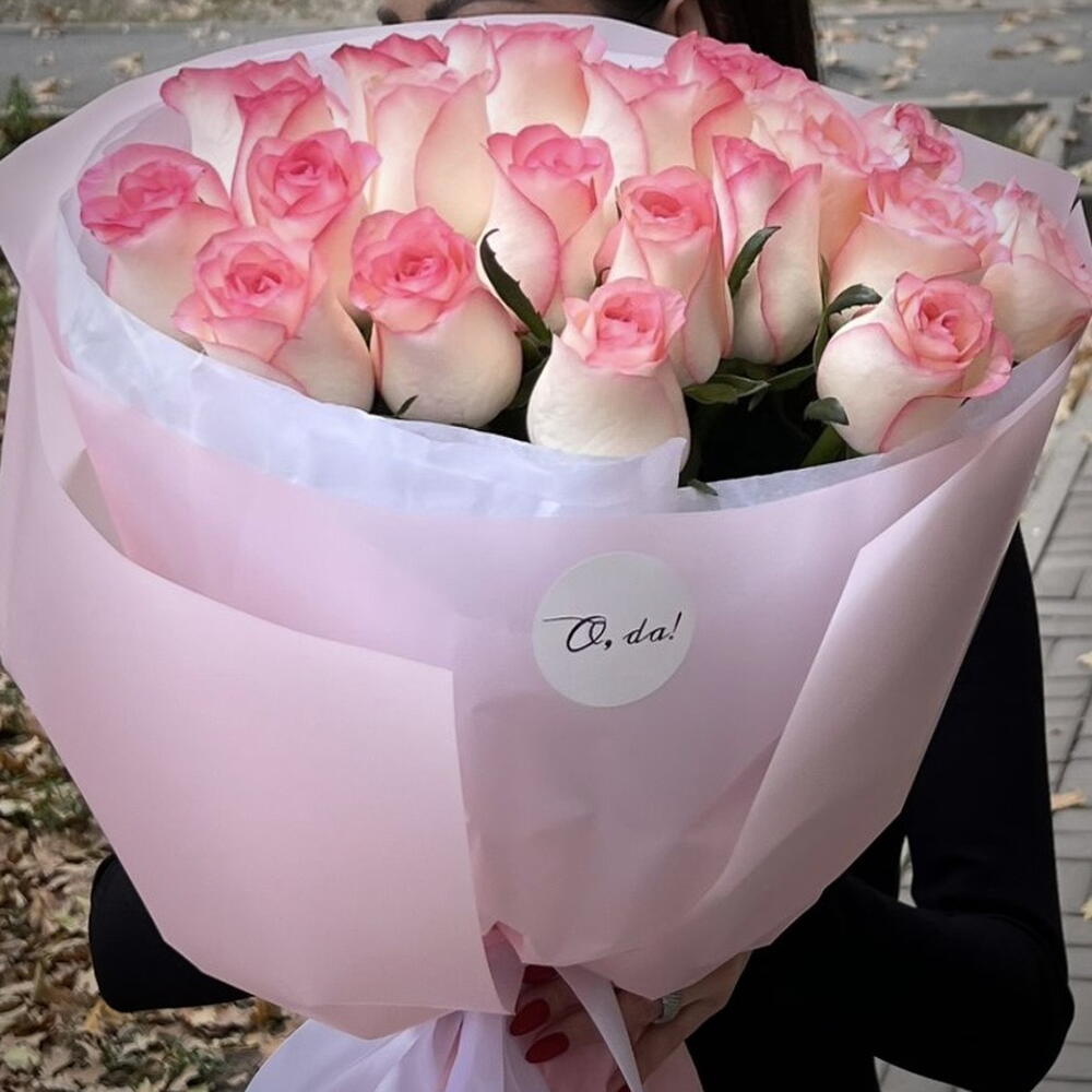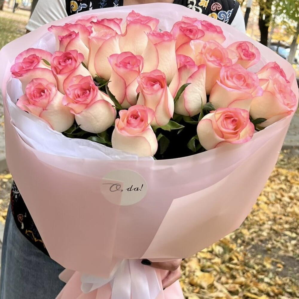 Кремово-розовый оттенок этих роз с чуть волнистыми краями нежнейших лепестков в букете, изящно оформленном в полупрозрачную упаковку аква бумаги обязательно поднимет настроение его обладателю. От этого букета исходит редкое сочетание силы и слабости, настойчивости и деликатности, пожелания, но не мольбы). Уместен для любого вида поздравления, выражения благодарности при достойном представления себя как личности. Наслаждайтесь!