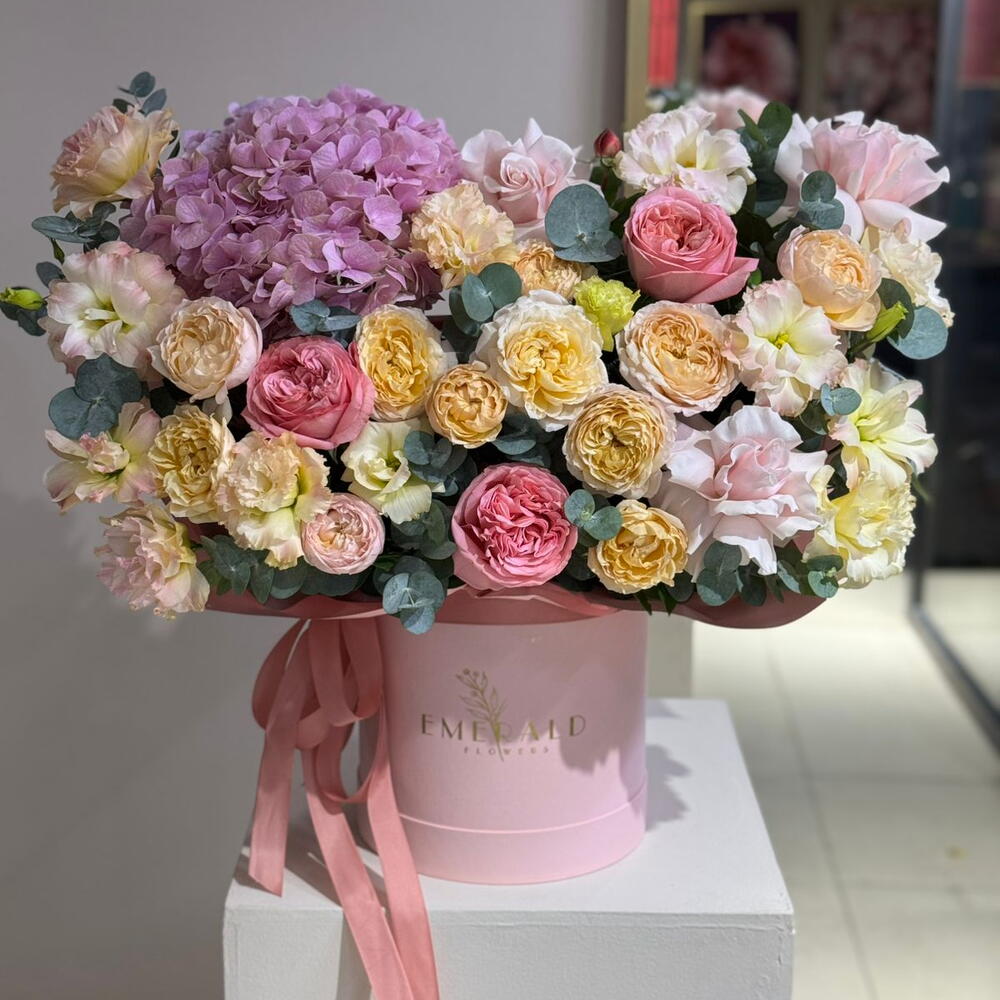 Hydrangea - 1 pcs Eustoma - 5 pcs Eucalyptus bunch - 1 pcs pink mondial - 3 pcs juliet bush rose peony - 3 pcs pink express - 3 pcs коробка брендированная м - 1 pcs
