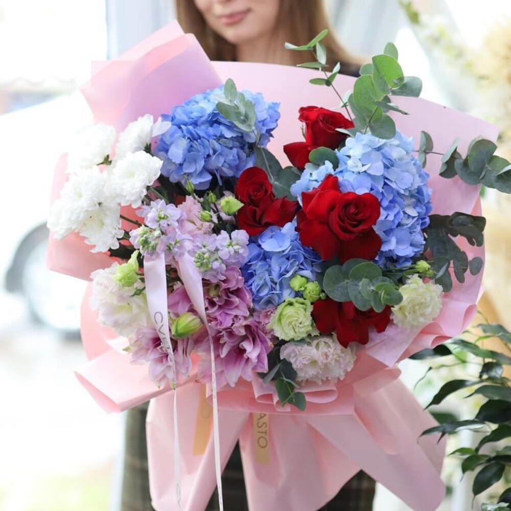 Hydrangea - 3 pcs Lisianthus - 2 pcs Lily - 1 pcs Matthiola - 2 pcs Chrysanthemum bush - 1 pcs Eucalyptus - 5 pcs Rose - 4 pcs
