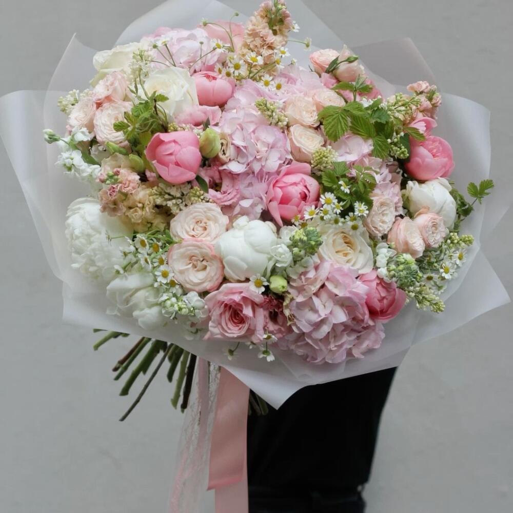 Hydrangea - 3 pcs Eucalyptus - 2 pcs Spray rose - 7 pcs peonies by Sarah Bernhardt - 11 pcs