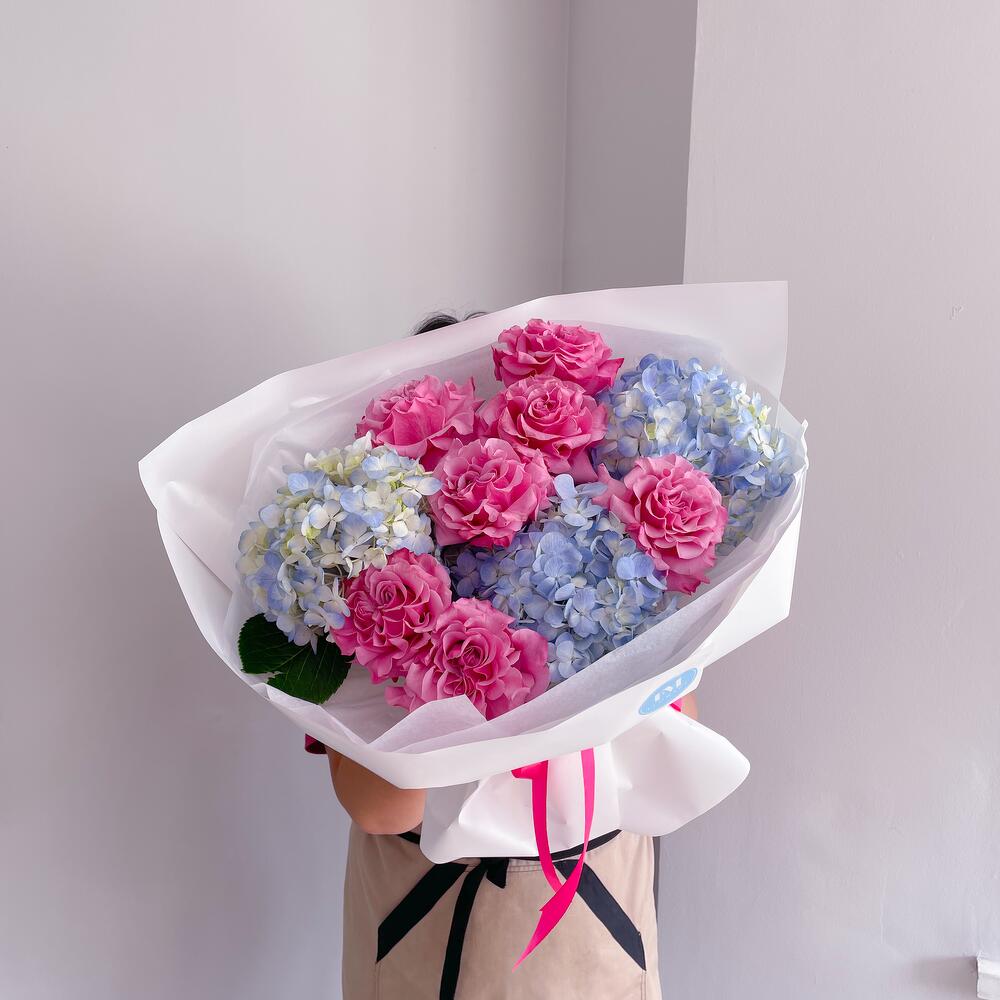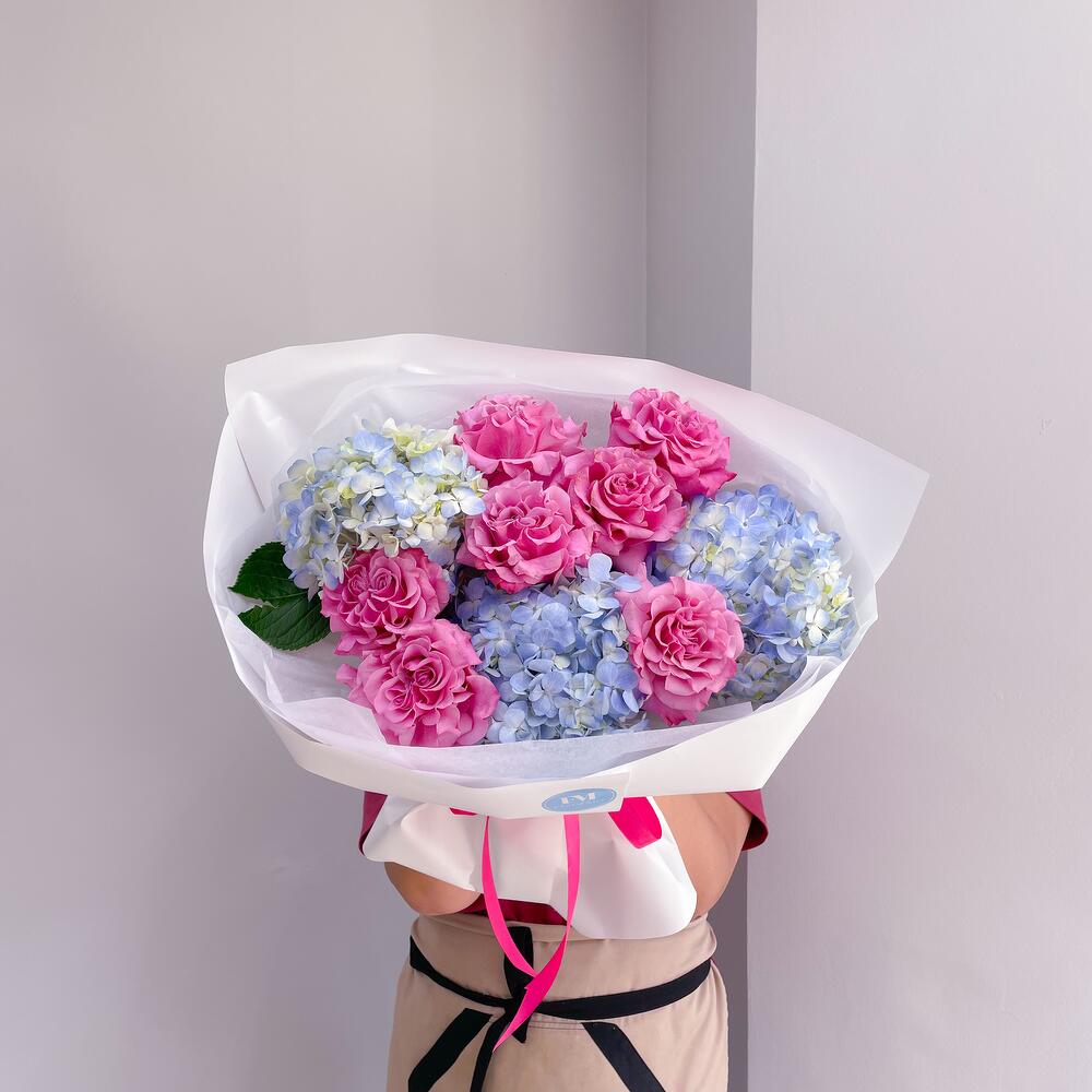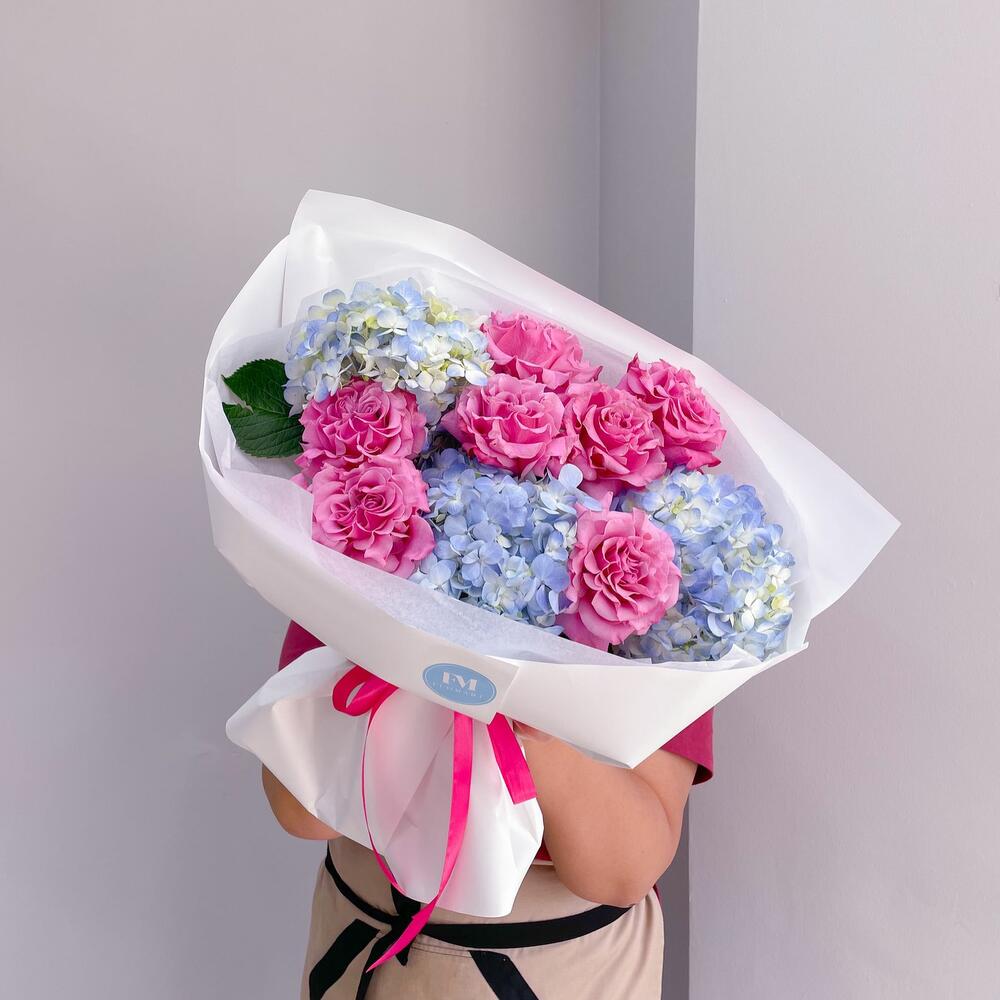 Hydrangea - 3 pcs peony - shaped roses - 7 pcs