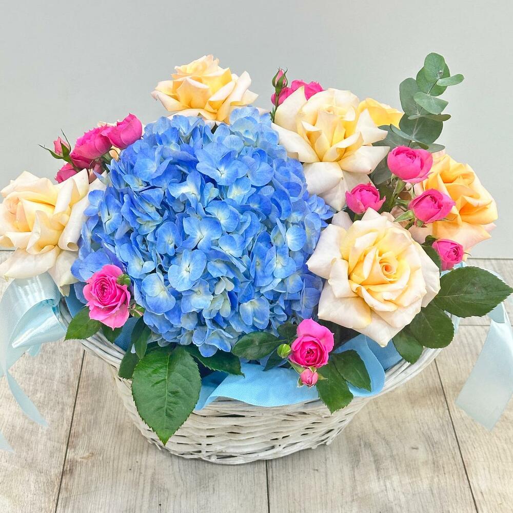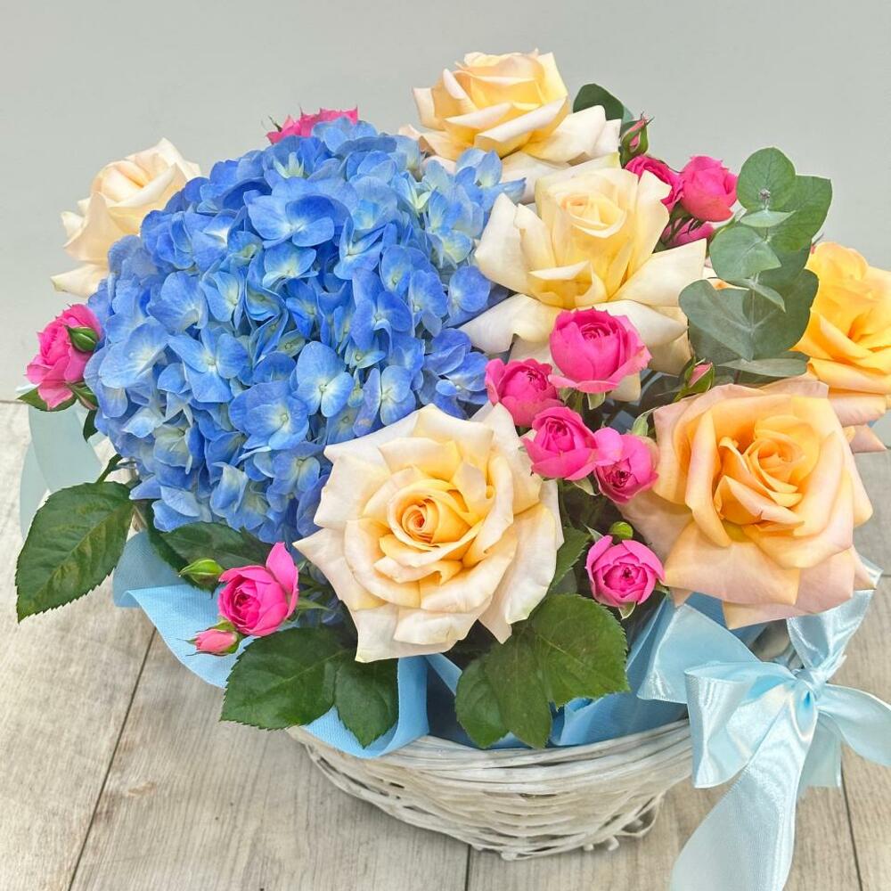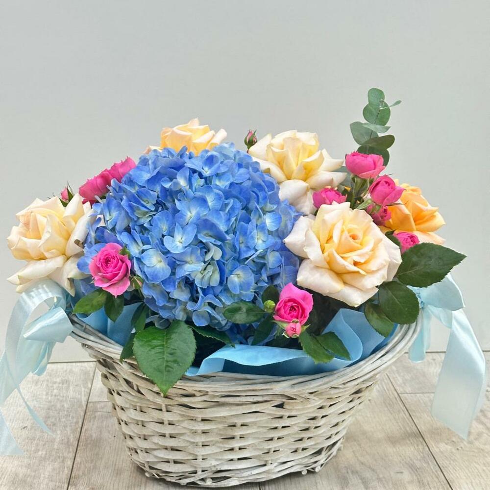 Bush rose - 3 pcs Eucalyptus - 1 pcs Rose - 7 pcs Satin ribbon - 1 pcs Basket wicker - 1 pcs Blue hydrangea - 1 pcs Floral oasis - 3 pcs