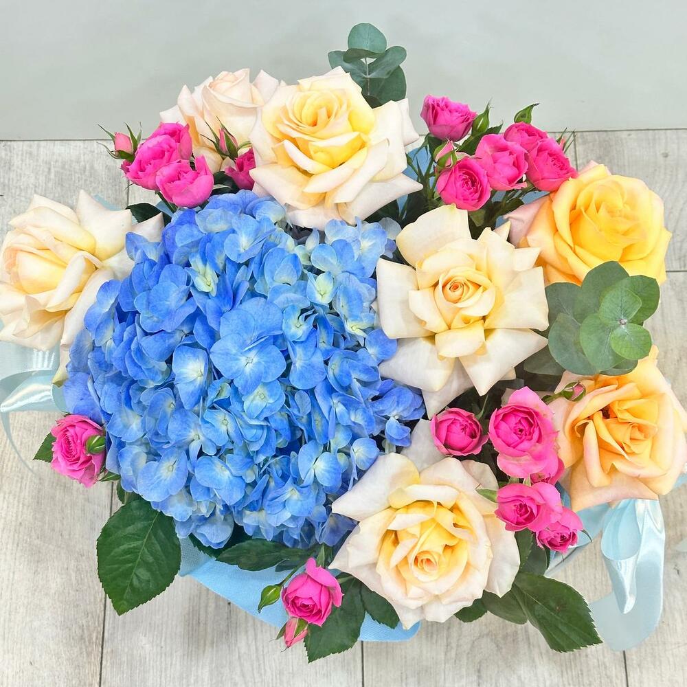 Солнечные розы и синяя гортензия напомнит о теплом побережье и вызовит улыбку ваших близких