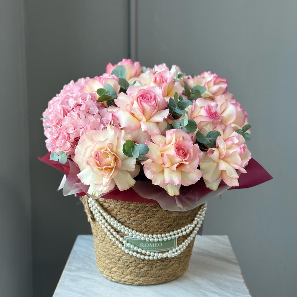 Hydrangea - 2 pcs Tape - 1 pcs Eucalyptus - 1 pcs Rose - 11 pcs Ornamental flowerpot - 1 pcs The bead - 1 pcs Floral oasis - 3 pcs