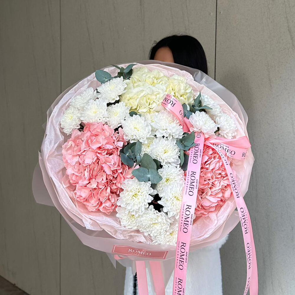 Hydrangea - 3 pcs Tape - 1 pcs Chrysanthemum bush - 4 pcs Eucalyptus - 1 pcs Decoration - 1 pcs