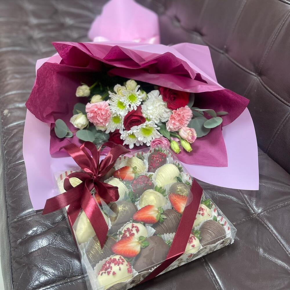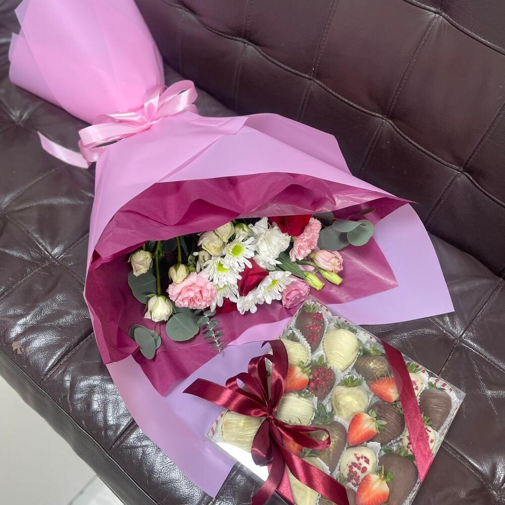 Set flowers and strawberries, Box - 22 by 22 cm, bouquet - 50 by 60 cm