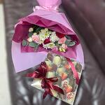 Strawberry - 2 pcs Lisianthus - 2 pcs Chrysanthemum bush - 1 pcs Eucalyptus - 2 pcs Rose - 3 pcs Dianthus - 3 pcs Postcard - 1 pcs Chocolate-covered strawberries - 15 pcs