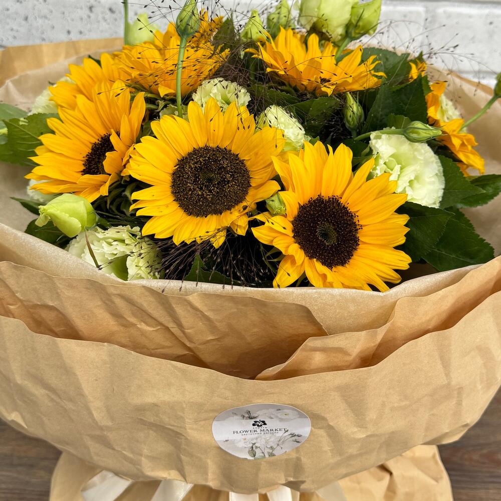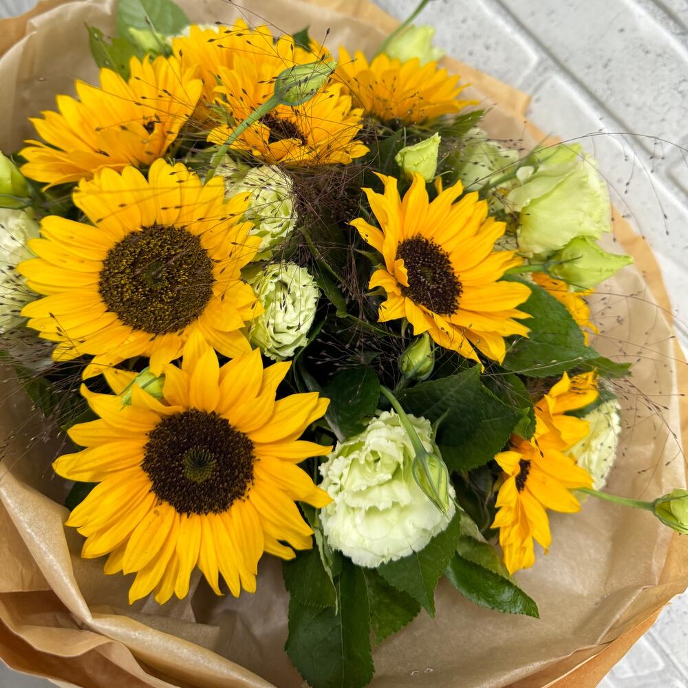 Eustoma - 5 pcs Silence - 3 pcs Sunflower - 9 pcs Crafting - 4 pcs decorative greenery bunch - 1 pcs