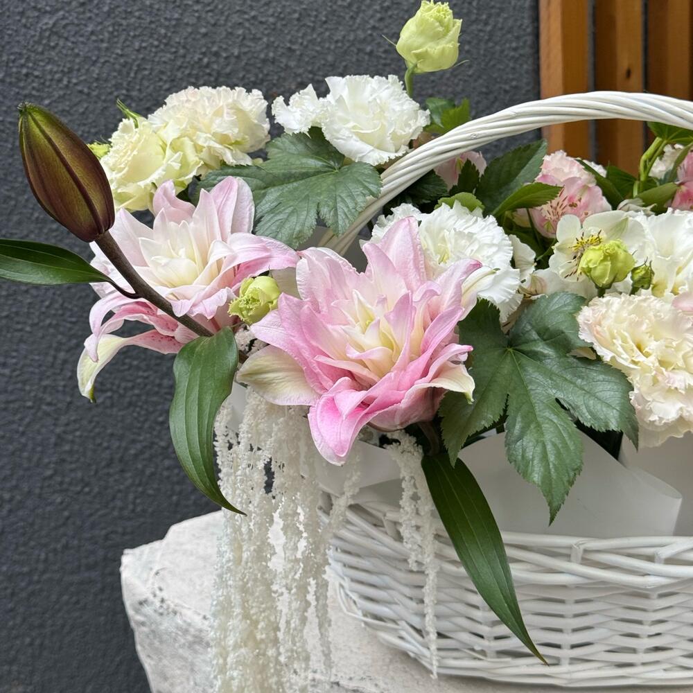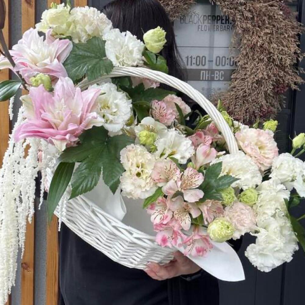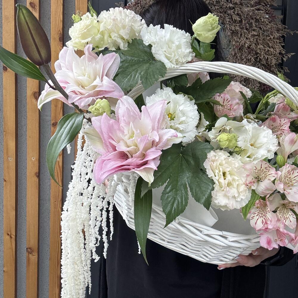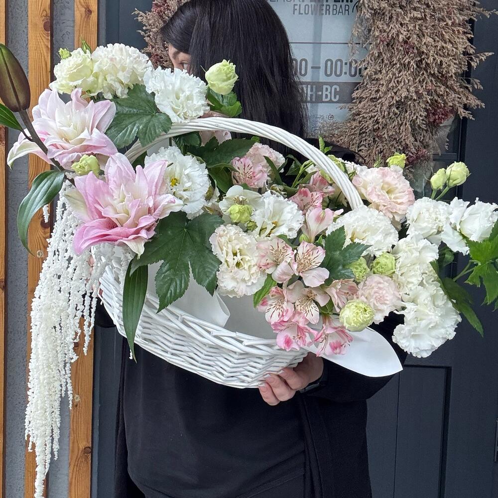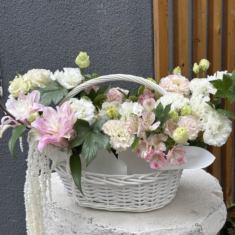 Обворожительная композиция из цветов в уютной корзине станет лучшим подарком для любого повода. Сочетание изящной лилии, четырех светлых альстромерий, элегантных семи эустом, комплиментировано легкой нежностью двух веток зелени и уникальной красотой амаранта. Этот цветочный ансамбль унесет в мир прикосновения красоты и гармонии.