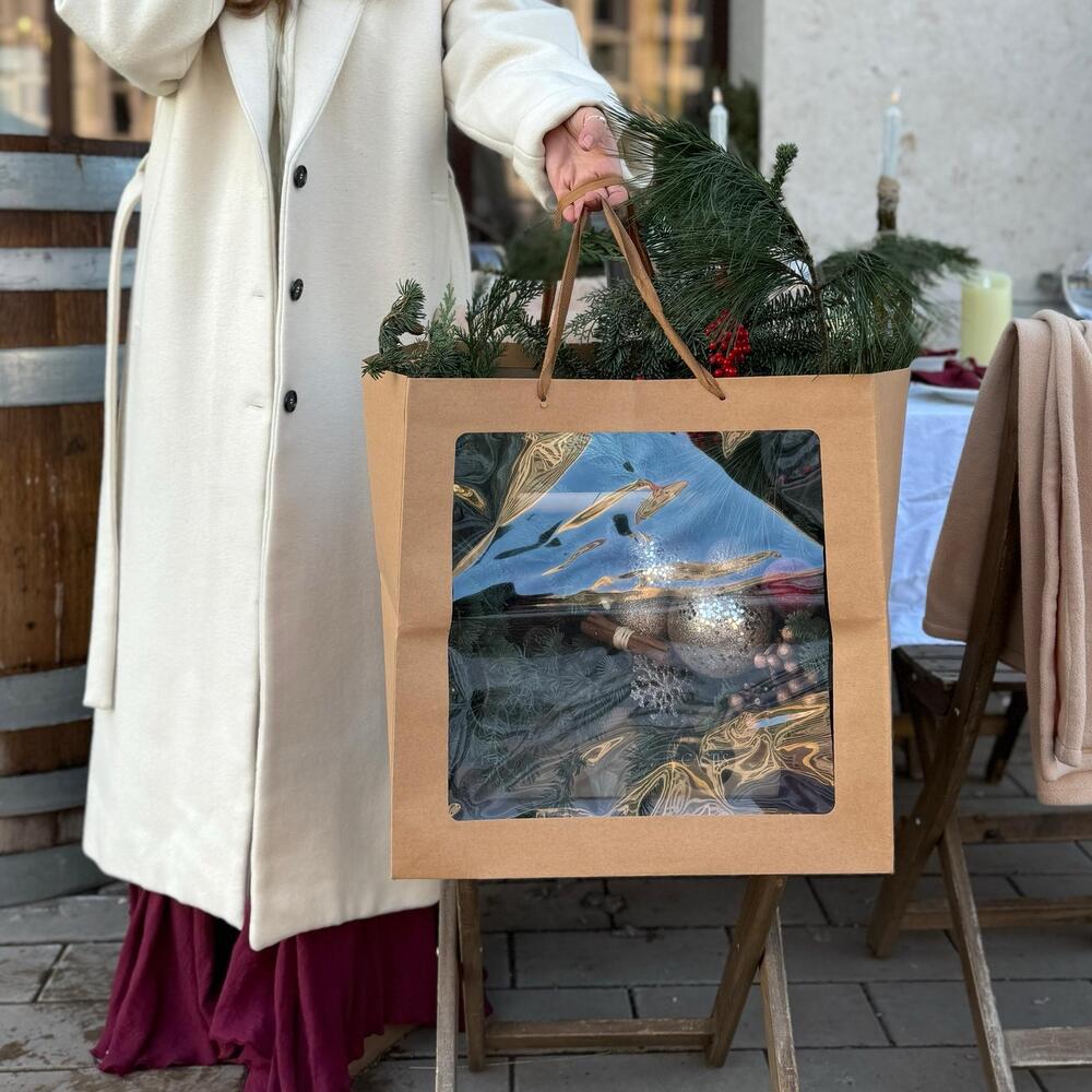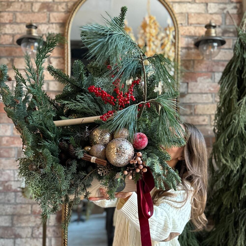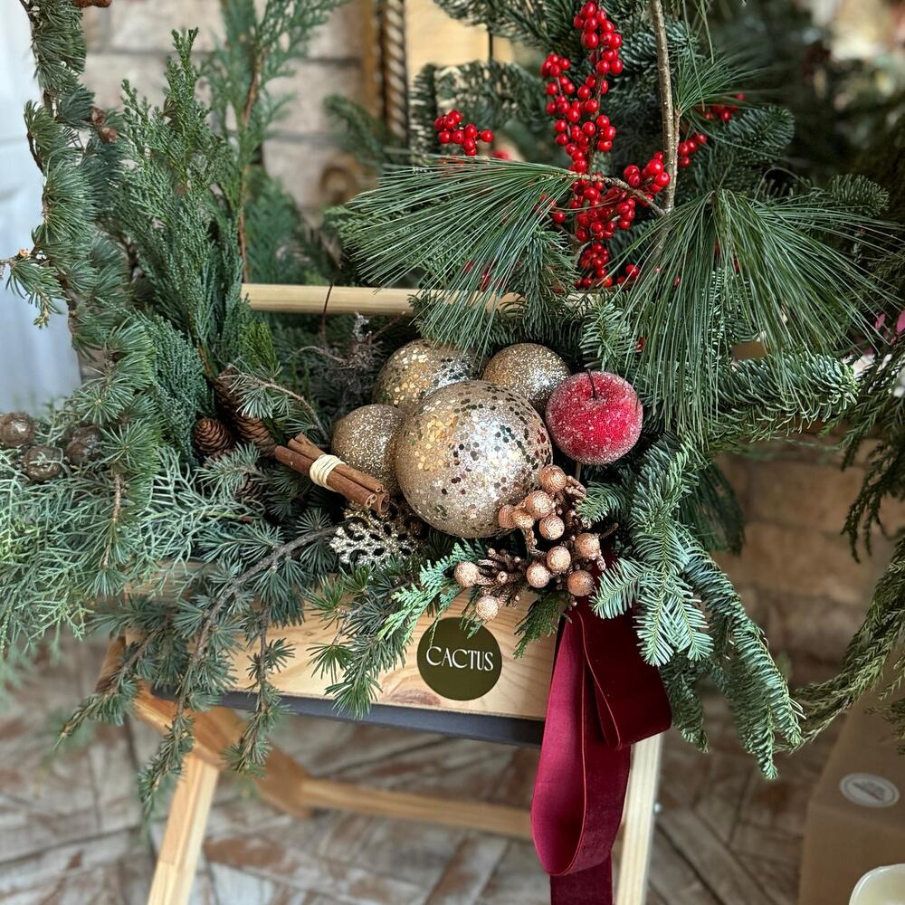 Ilex - 1 pcs Cypress - 1 pcs Wooden box - 1 pcs Tuya - 2 pcs Brunia dyed - 2 pcs Nobilis - 1 pcs Christmas balls - 6 pcs Pinus - 1 pcs Floral oasis - 2 pcs cedar branch - 1 pcs