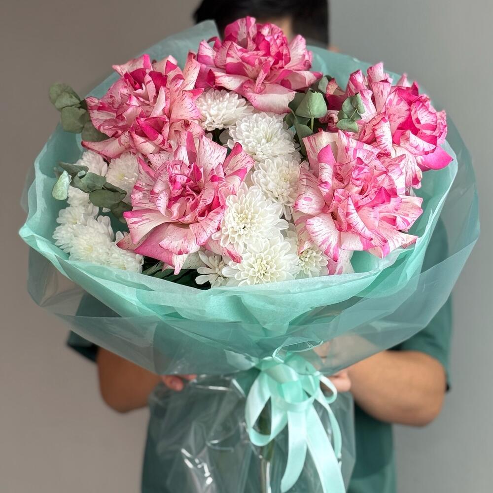 Chrysanthemum bush - 5 pcs Eucalyptus - 5 pcs Rose of France - 5 pcs Decoration - 1 pcs