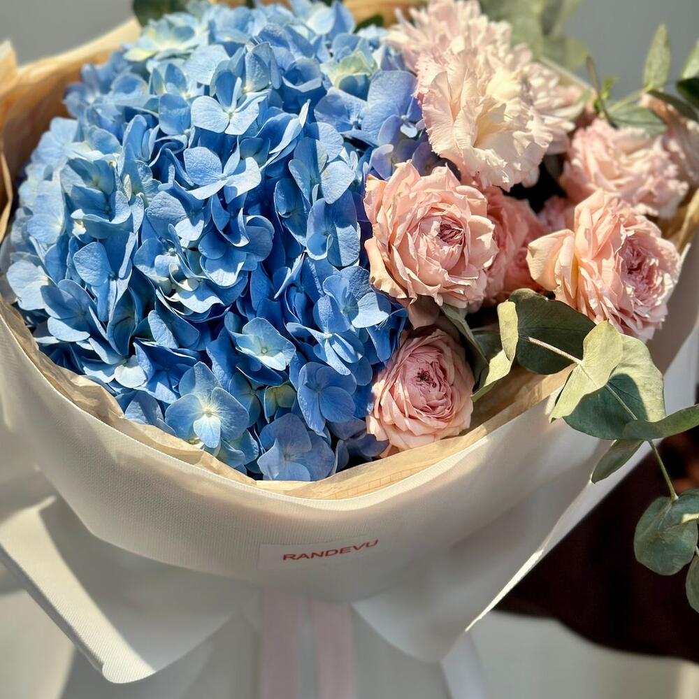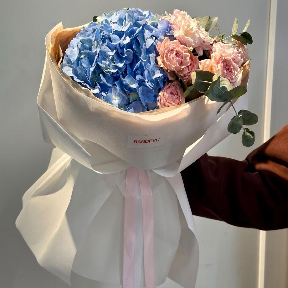 Hydrangea - 1 pcs Eucalyptus - 1 pcs Silence - 3 pcs Peony bush rose - 3 pcs Foamiran (packaging) - 3 pcs eustoma - 2 pcs