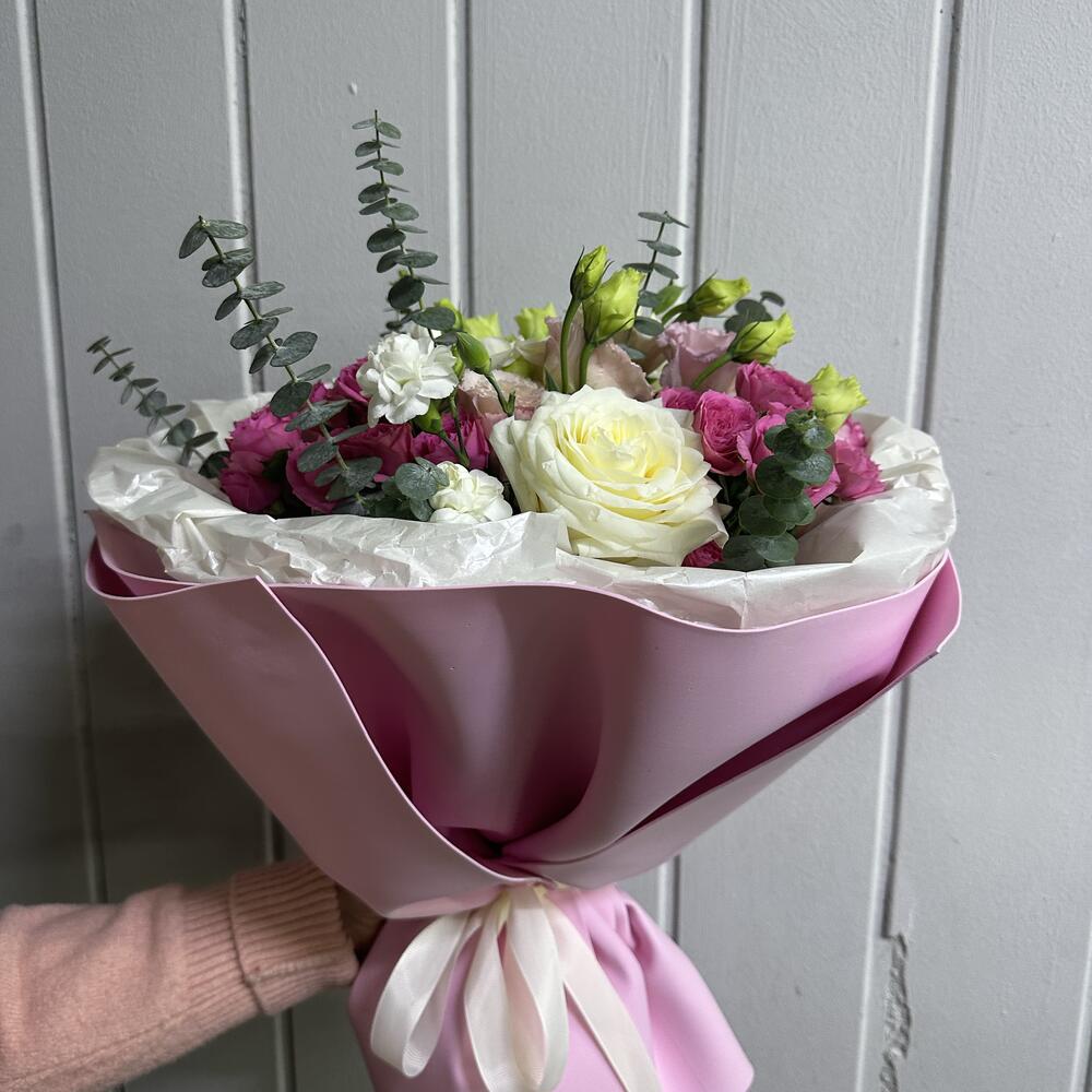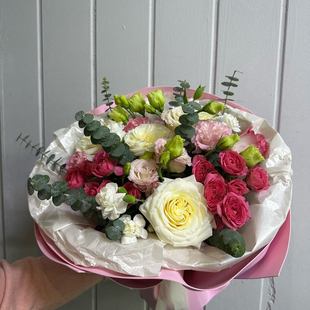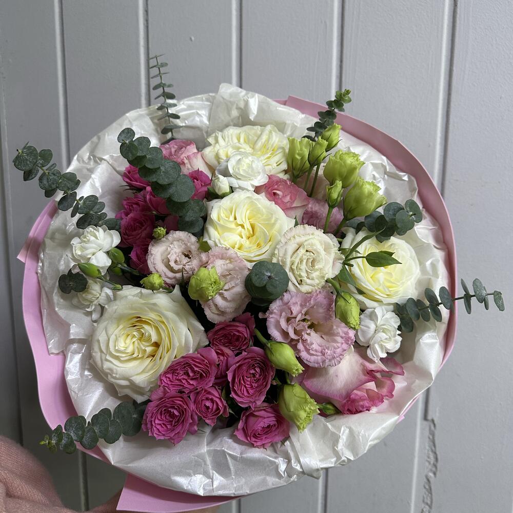 Lisianthus - 3 pcs Bush rose - 2 pcs One - headed rose - 3 pcs Peony-like rose - 4 pcs Eucalyptus Mix - 5 pcs Bush dianthus - 2 pcs