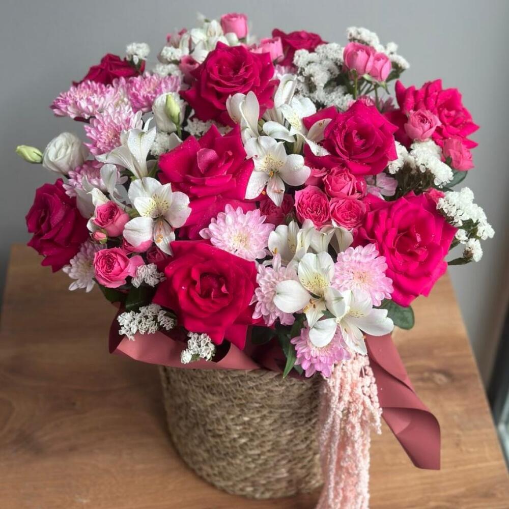 Alstroemeria - 3 pcs Static - 4 pcs Rose - 10 pcs Chrysanthemum - 2 pcs Amaranth - 1 pcs Spray rose - 4 pcs