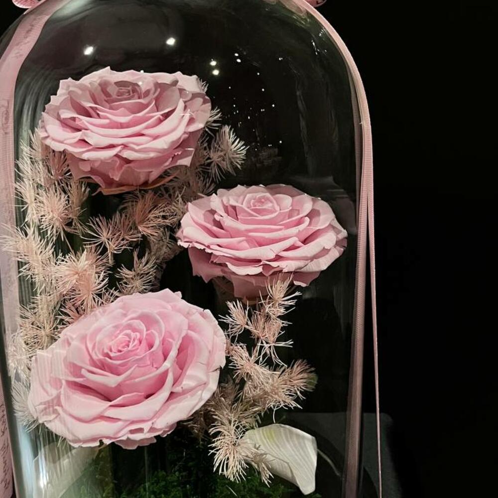 Этот изысканный комплект стабилизированных цветов, включающий в себя три пудрово-розовые розы и три ветви в нежных пастельных тонах, станет украшением любого интерьера. Он идеально подойдёт в качестве подарка для близкого человека. Все компоненты аккуратно помещены в стильную стеклянную колбу, что придает цветам еще большей эстетической ценности. Стабилизированные цветы сохраняют свою свежесть в течение долгого времени, что позволяет наслаждаться их красотой годами.