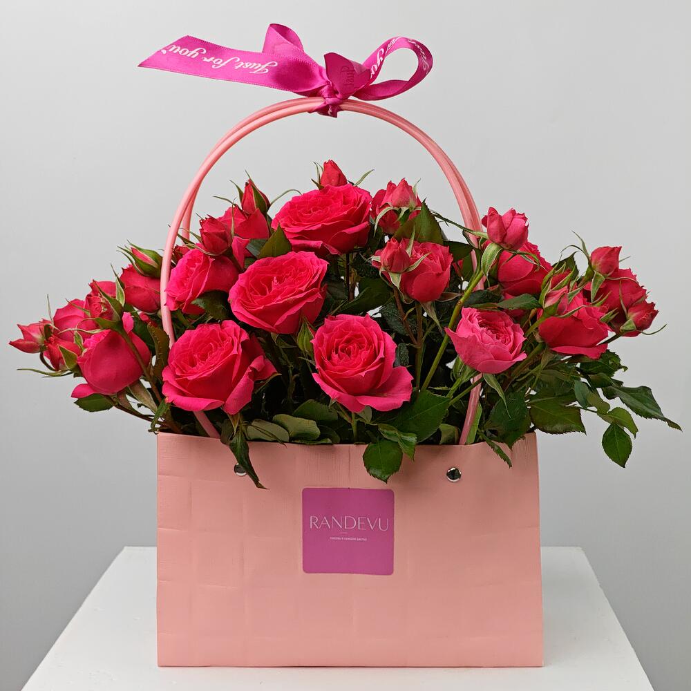 Этот букет в форме стильной розовой сумочки - воплощение игривой элегантности . Яркие кустовые розы пылающего малинового оттенка идеально сочетаются с минималистичным дизайном упаковки ,создавая атмосферу легкости и радости .Лента с изящным бантом добавляет завершающий штрих,превращая композицию в настоящее послание счастья.