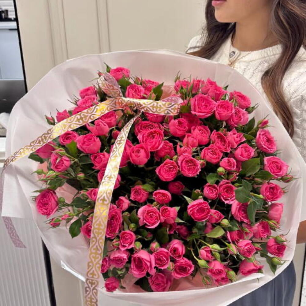 Пышный букет из ярко-розовых кустовых роз — энергия, любовь и вдохновение в одном букете! Очень стойкий состав, лучшее соотношение цены и объема👍