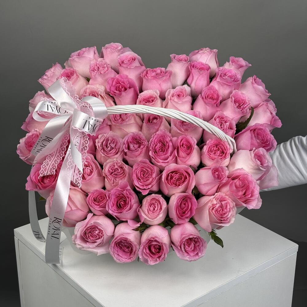 Очаровательная композиция из розовых роз, аккуратно оформленных в форме сердца. Цветы оформлены в белую плетенную корзину, украшенную атласными лентами, что придает романтический и изысканный вид. Такой букет станет идеальным подарком, для выражения искренних чувств