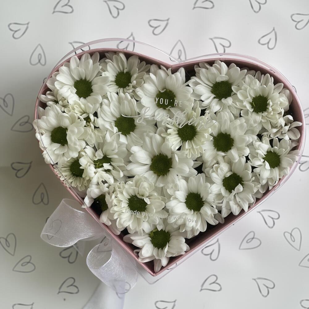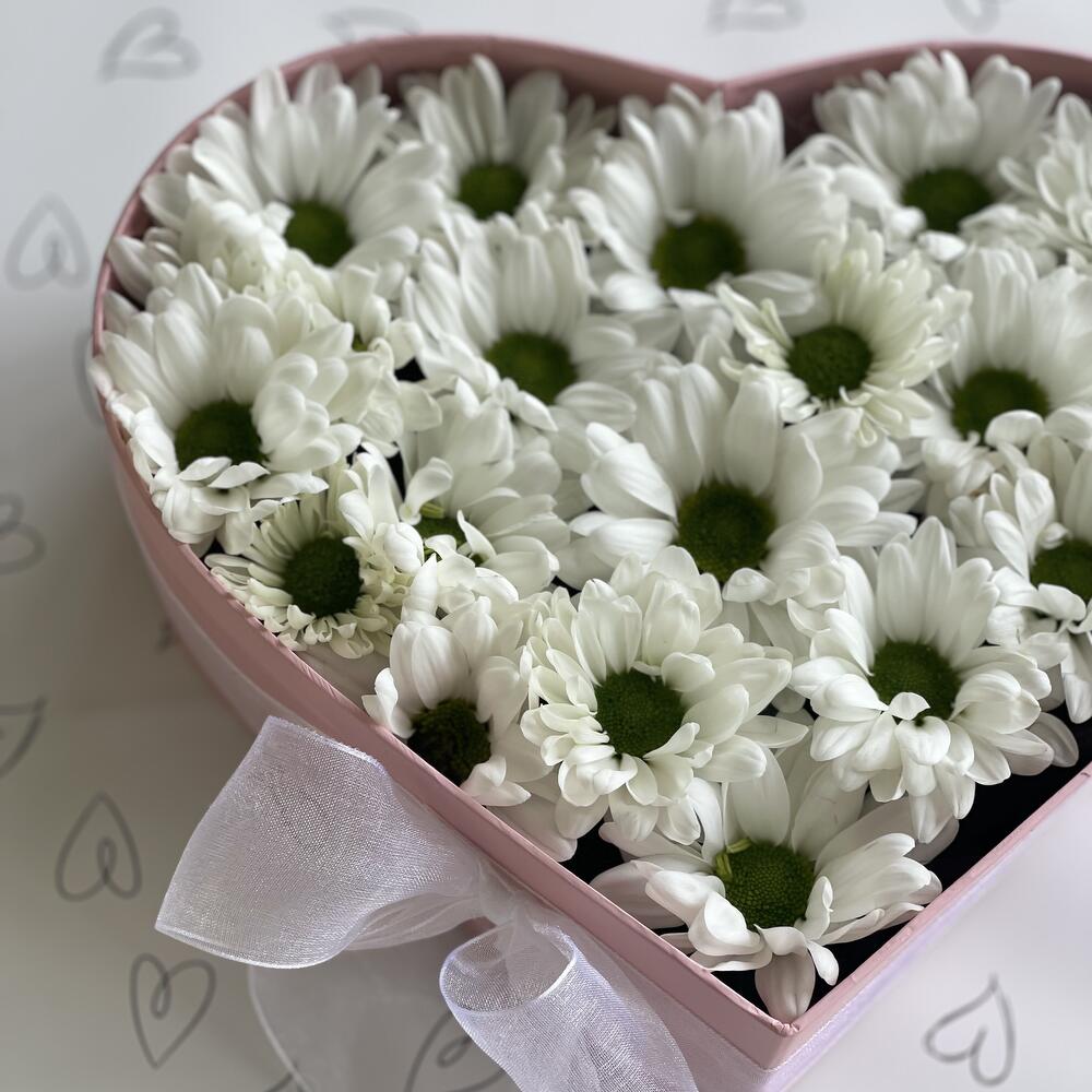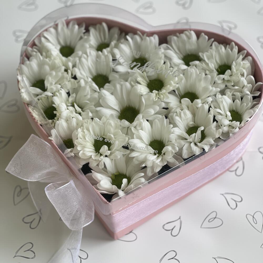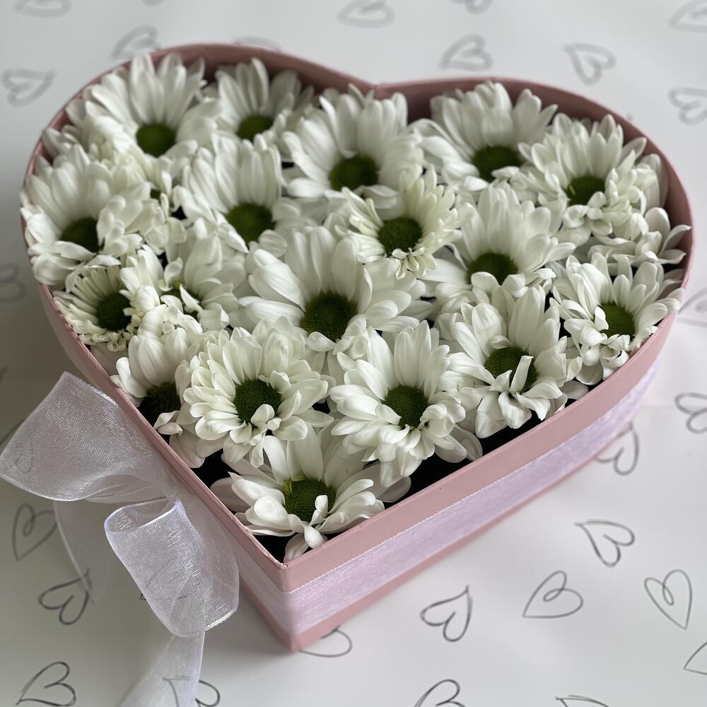 Bush chrysanthemum - 3 pcs Bow - 1 pcs Heart Box - 1 pcs Floral oasis - 1 pcs