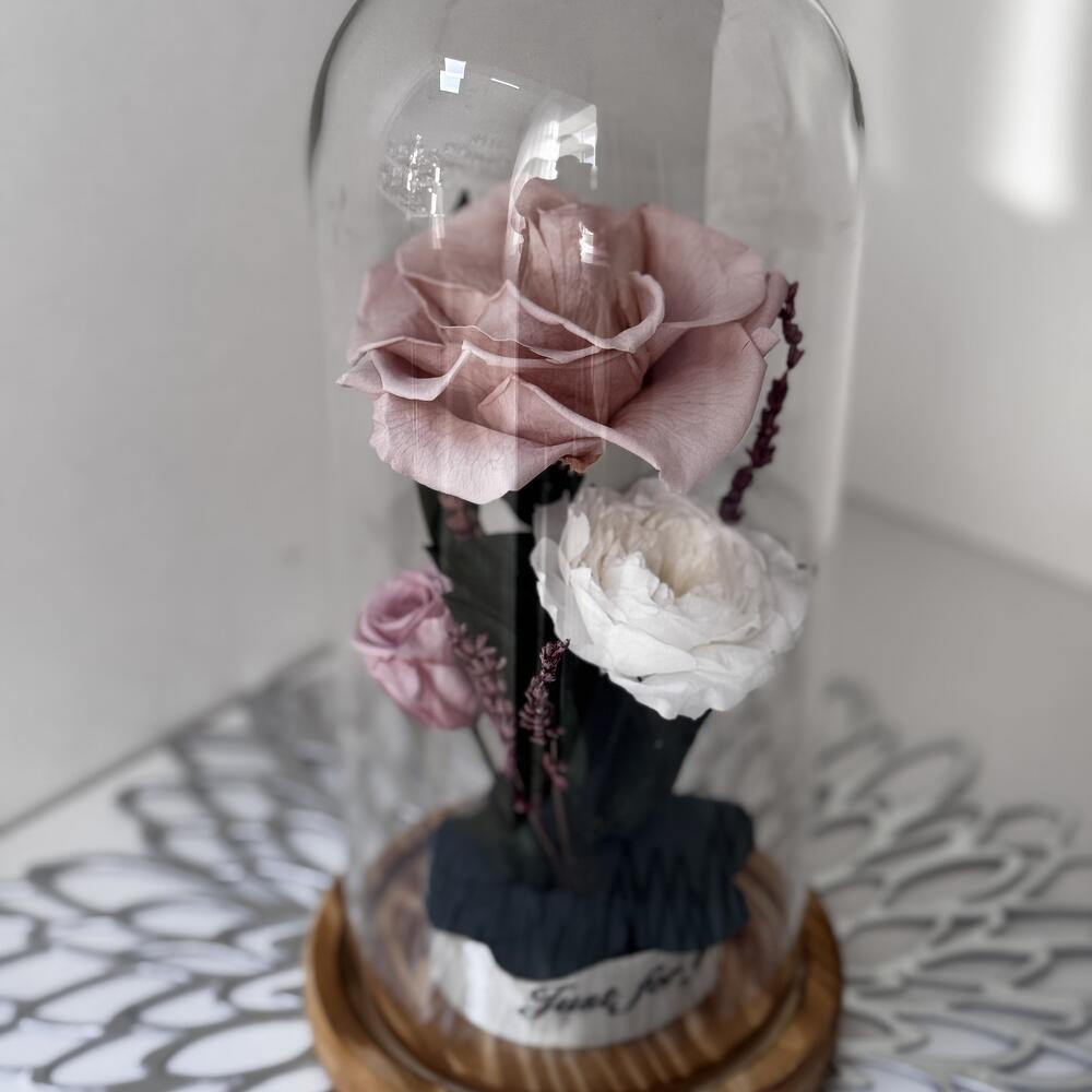 Cotton - 1 pcs Stabilized Rose - 1 pcs Glass Cloche - 1 pcs stabilized greens - 3 pcs стабилизированная гвоздика 4 - 1 pcs