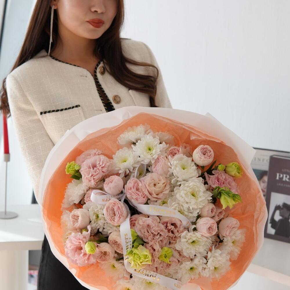 Lisianthus - 5 pcs Peony - shaped bush rose - 5 pcs baltic white chrysanthemum - 4 pcs