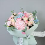 Hydrangea - 3 pcs Rose - 5 pcs Bush rose - 3 pcs Carnation - 3 pcs Eucalyptus Mix - 3 pcs