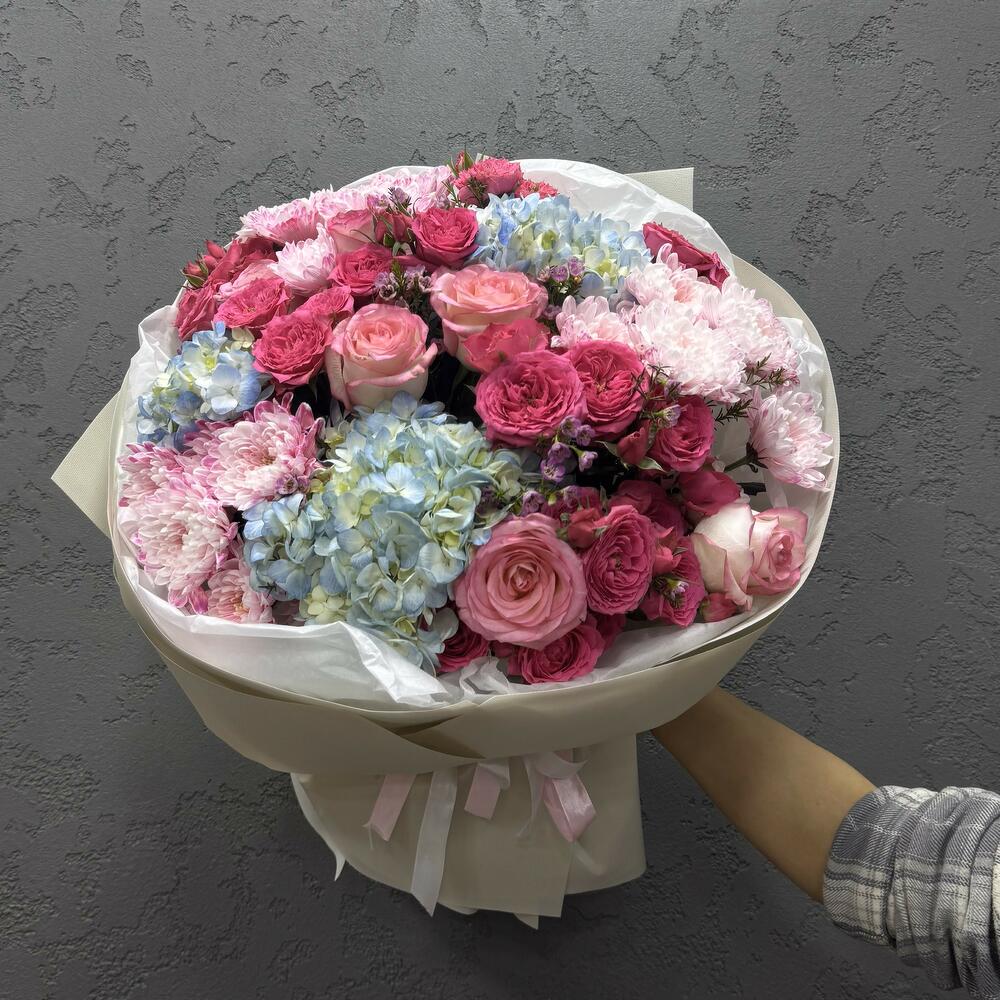 Насыщенный и выразительный букет в розово-голубой гамме. Крупные розы, пышные хризантемы и воздушные гортензии создают эффектный и гармоничный образ. Этот букет дарит тепло, радость и восхищение — отличный выбор для особого повода или просто чтобы порадовать близкого человека.