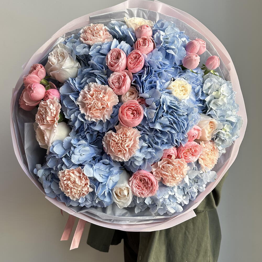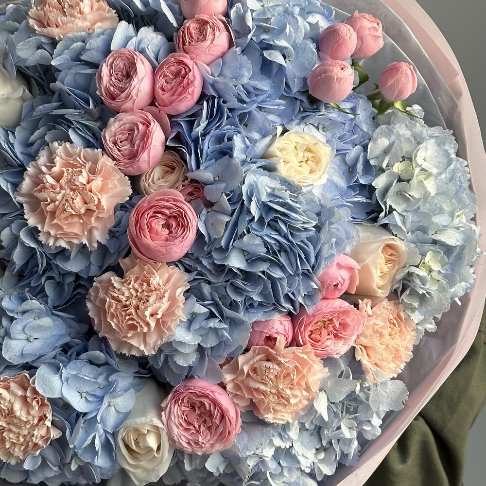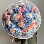 Hydrangea - 7 pcs Carnation - 7 pcs Spray rose - 6 pcs varietal rose - 7 pcs