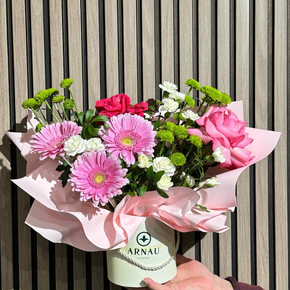 Gerbera - 3 pcs Santini - 3 pcs Box - 1 pcs Dianthus bush - 3 pcs roses - 2 pcs
