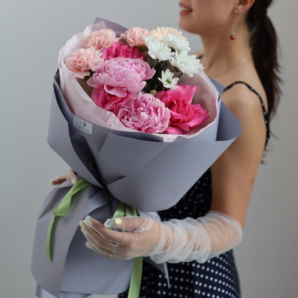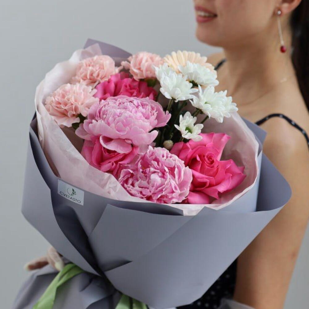 Этот букет — как роман о женщине, в которой сочетаются сила и нежность, грация и яркий характер. Пионы дарят ему объём и лёгкую томность, французские розы — чувственность и утончённость. Диантусы добавляют структуру и ритм, а герберы и хризантемы — лучистую энергию, как отражение её искренней улыбки. Композиция звучит, как признание: “Ты особенная. Ты вдохновляешь.” Он создан, чтобы впечатлить, растрогать, остаться в памяти. Такой букет выбирают не просто так — а когда хочется сказать больше, чем словами.