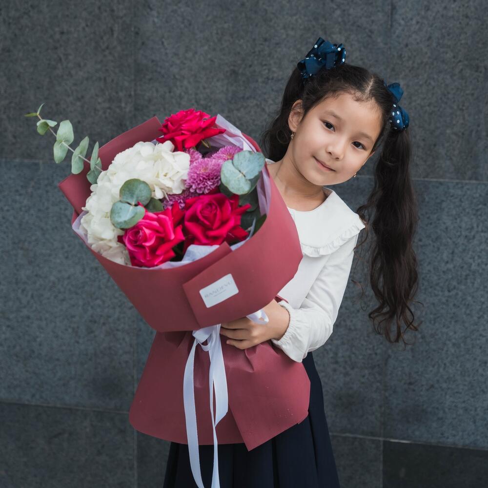 Hydrangea - 1 pcs Chrysanthemum bush - 1 pcs Eucalyptus Baby Blue - 2 pcs roses - 3 pcs