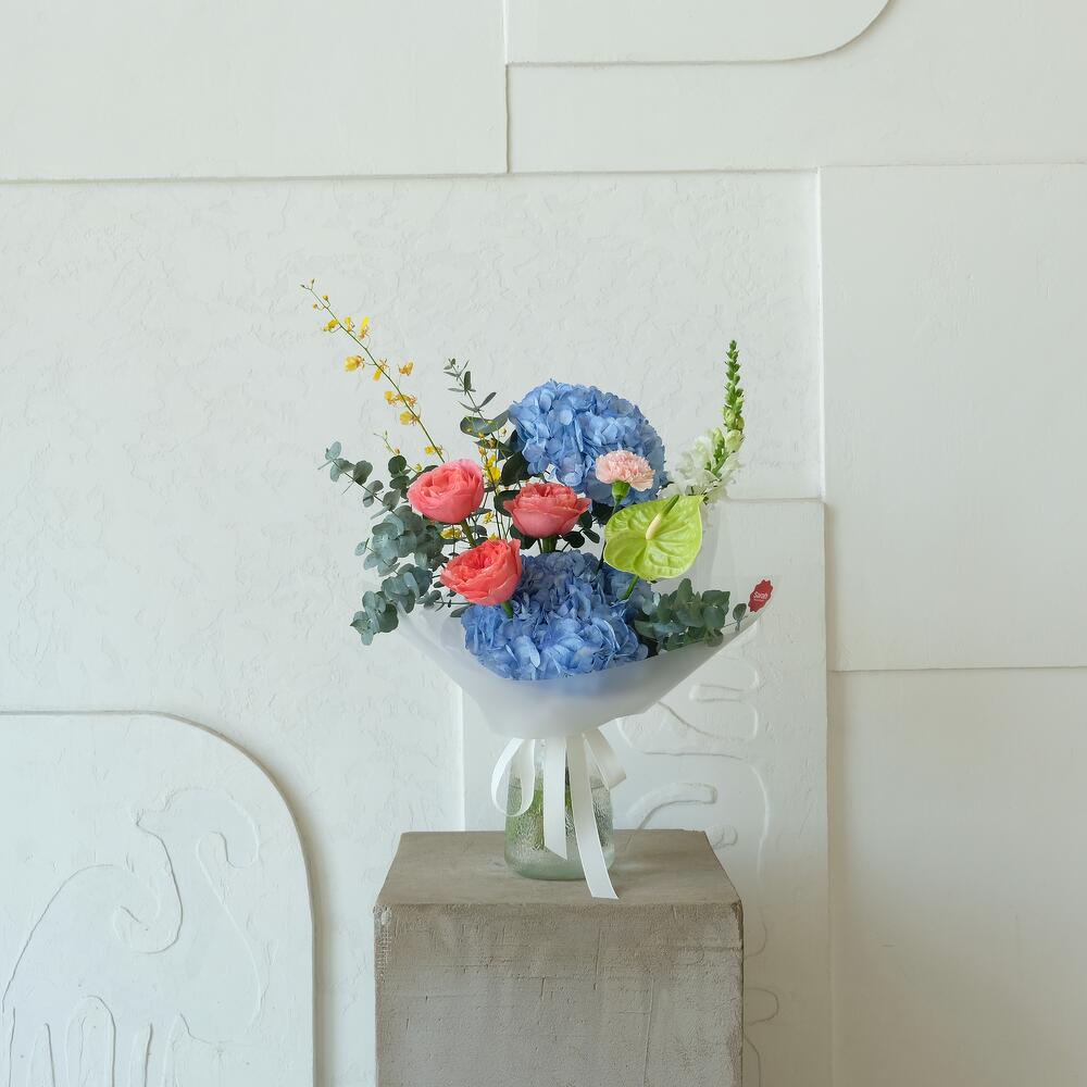 Anthurium - 1 pcs Hydrangea - 2 pcs Eucalyptus - 1 pcs Carnation - 1 pcs Peony - shaped rose - 3 pcs Snapdragon - 1 pcs oncidium - 1 pcs