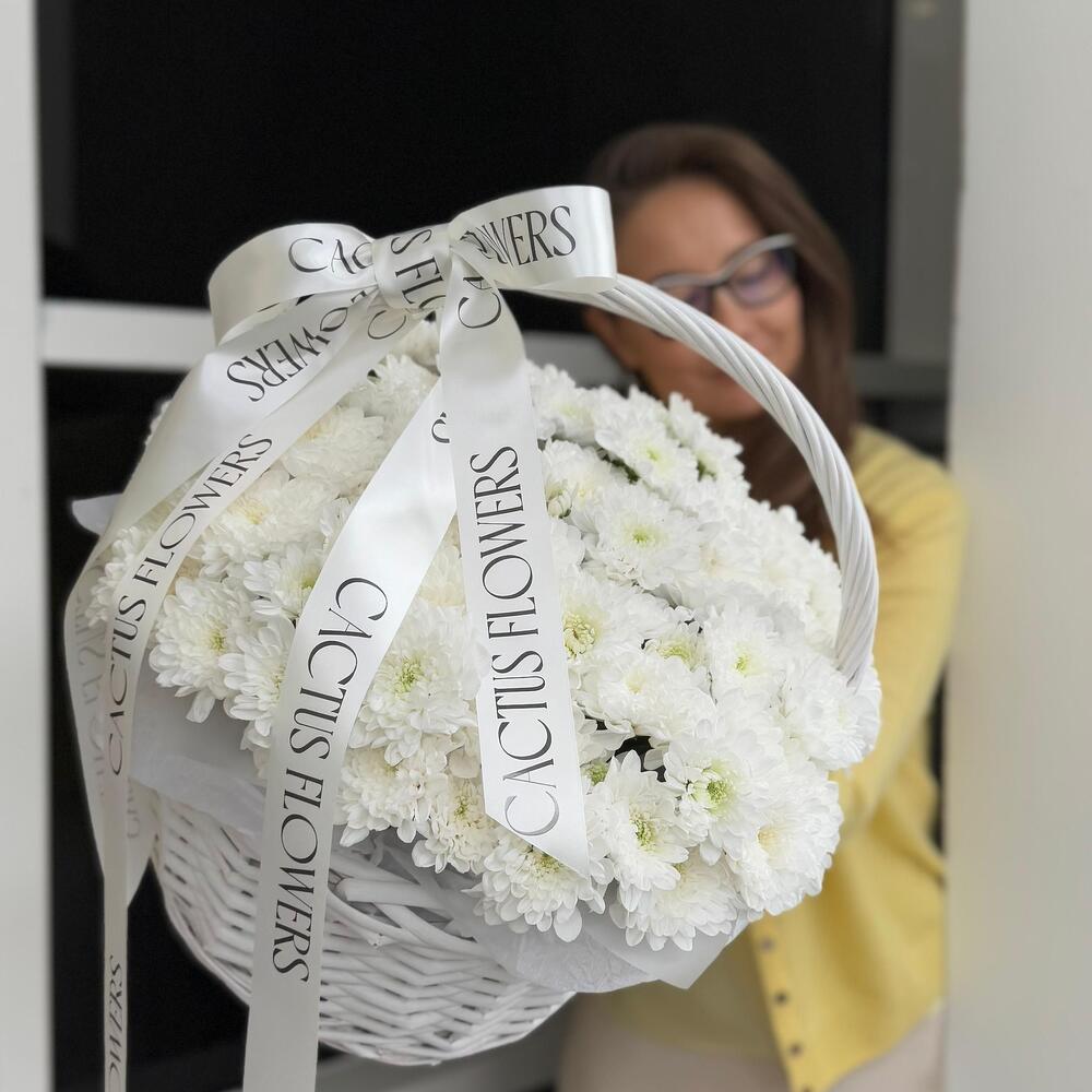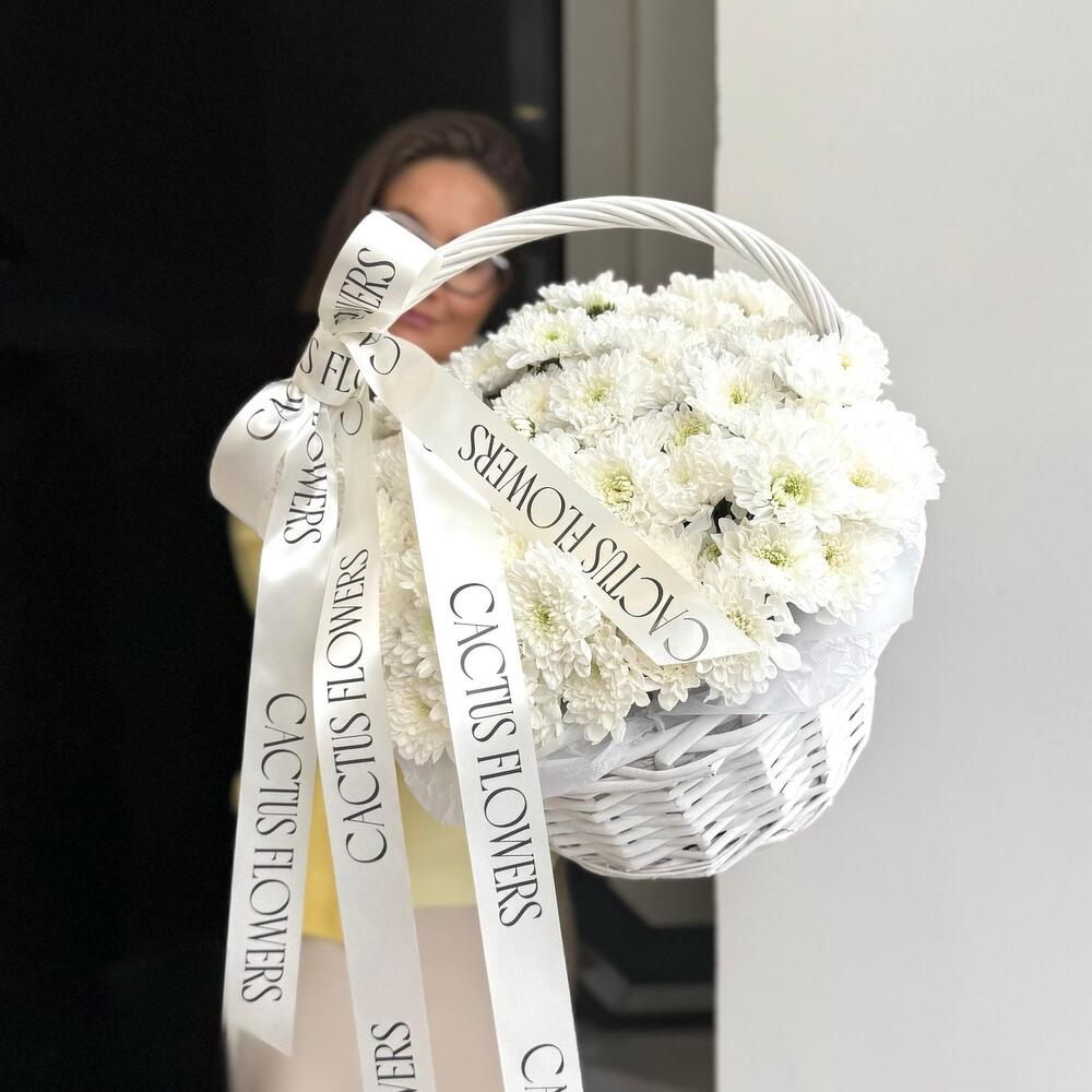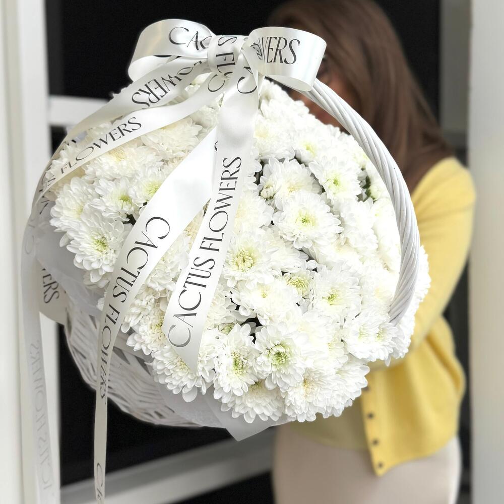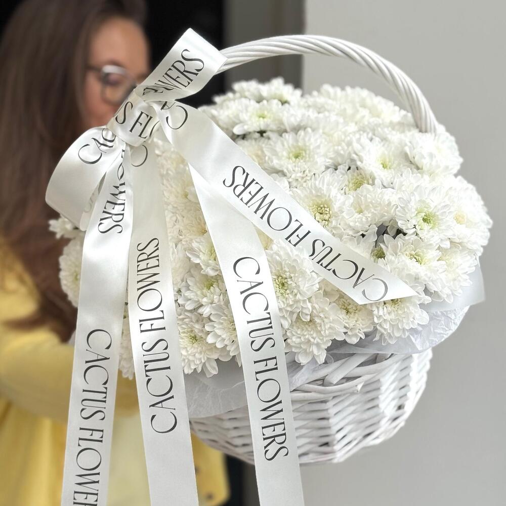 Корзина с кустовыми хризантемами сорта Алтай — это сочетание роскоши и сдержанной утончённости. Стойкие белоснежные цветы, дополненные фирменными лентами, создают изысканную композицию, которая будет долго сохранять свежесть и дарить радость своему обладателю.