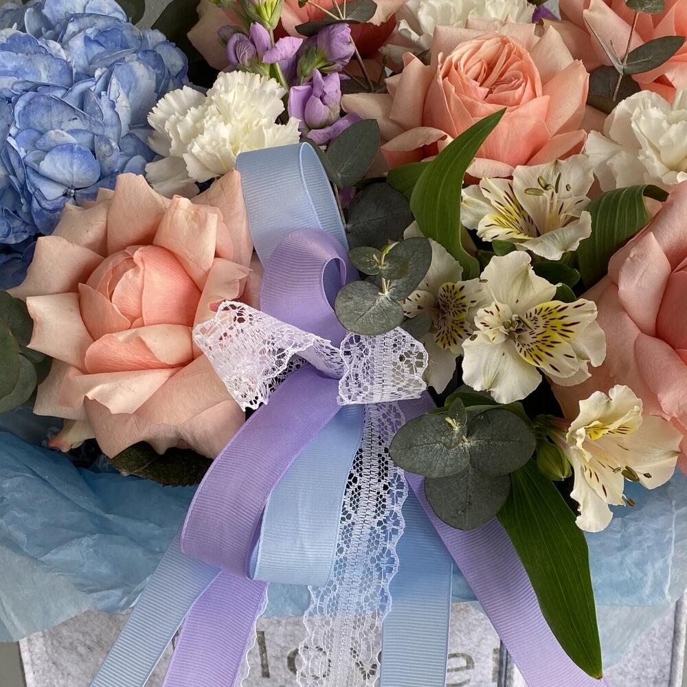 Alstroemeria - 1 pcs Matthiola - 2 pcs Dianthus - 3 pcs French Rose - 5 pcs Blue hydrangea - 1 pcs Eucalyptus Mix - 1 pcs