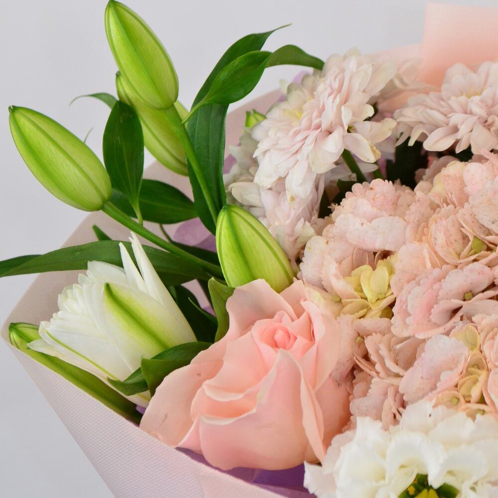 Hydrangea - 1 pcs Lisianthus - 1 pcs Lily - 1 pcs Chrysanthemum bush - 2 pcs roses - 7 pcs