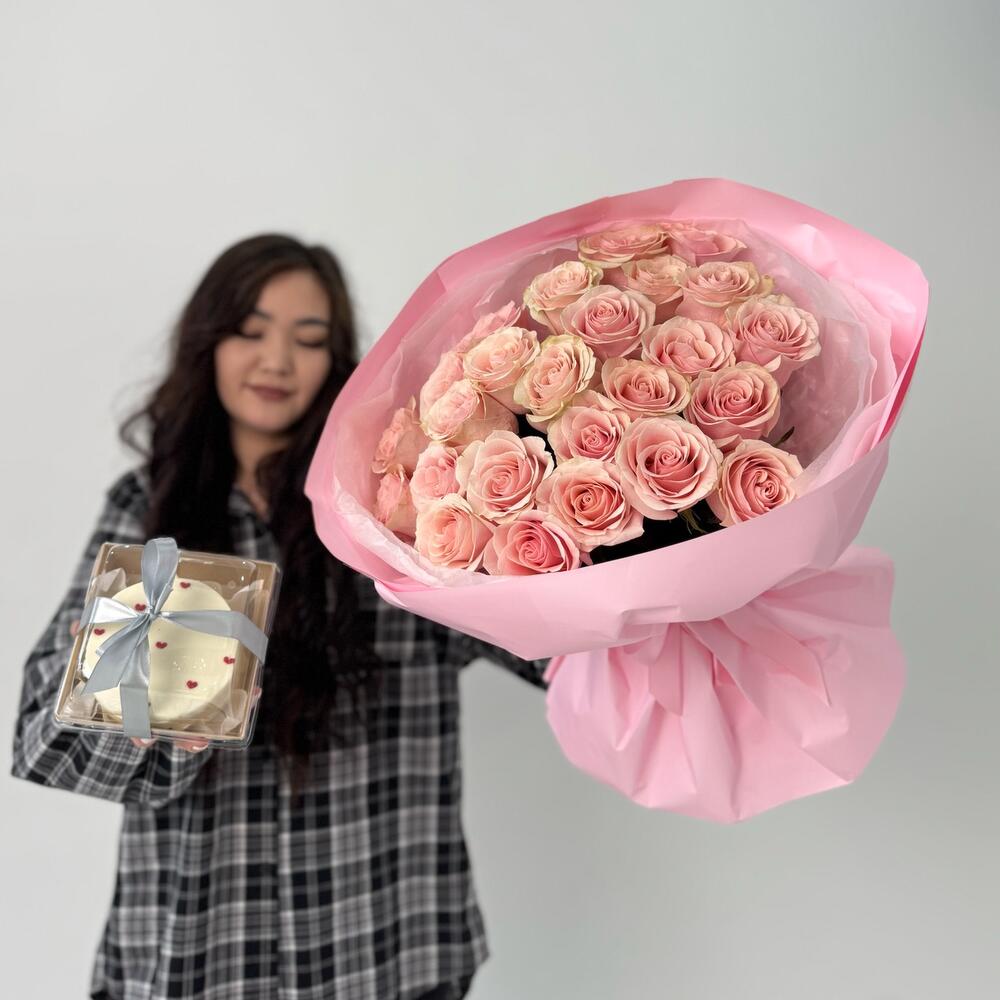 Сладкое комбо: букет из 25 роз+бенто торт Начинка молочная девочка