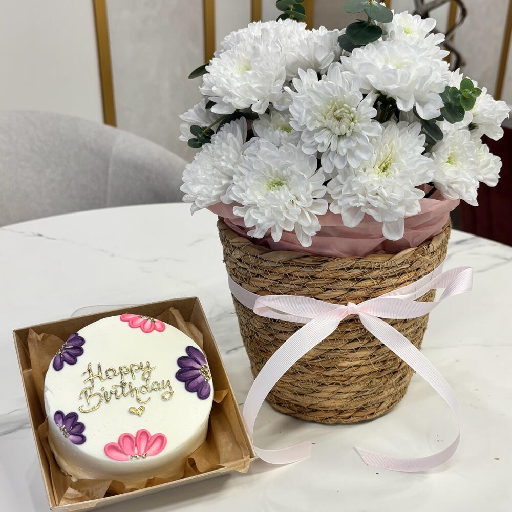 Идеальное сочетание нежности и уюта: воздушные белые хризантемы в плетёном кашпо, украшенном розовой лентой, и мини Bento-тортик. Такой сет подарит тепло, радость и ощущение заботы 🎂🤍
