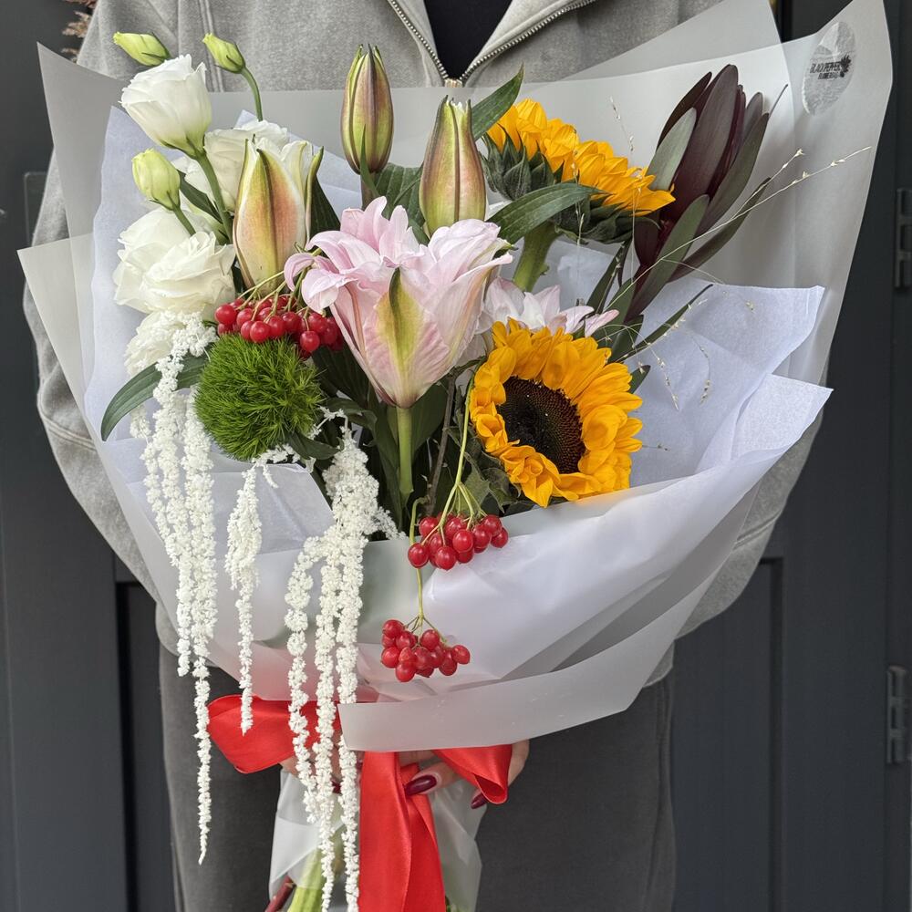 Lily - 1 pcs Eustoma - 1 pcs Sunflower - 2 pcs Amaranth - 2 pcs Kalina - 1 pcs Safari - 1 pcs barbatus - 1 pcs