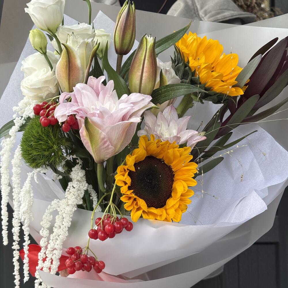 Этот авторский букет станет ярким акцентом любого важного события. Изысканная лилия, нежная эустома, солнечные подсолнухи, эффектные веточки амаранта, ягодная нотка калины, экзотический сафари и шармантный барбатус слились в уникальный цветочный ансамбль. Букет умело подчеркивает индивидуальность и стиль своего обладателя, оставляя незабываемые впечатления.