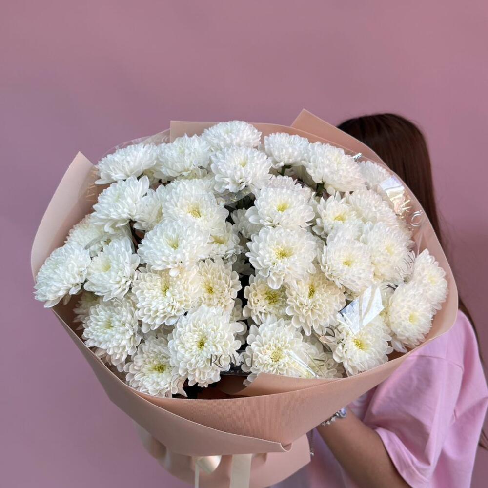 Объёмный букет из белоснежных хризантем в нежной упаковке. Универсальный подарок для любого повода — символ чистоты, заботы и тепла.