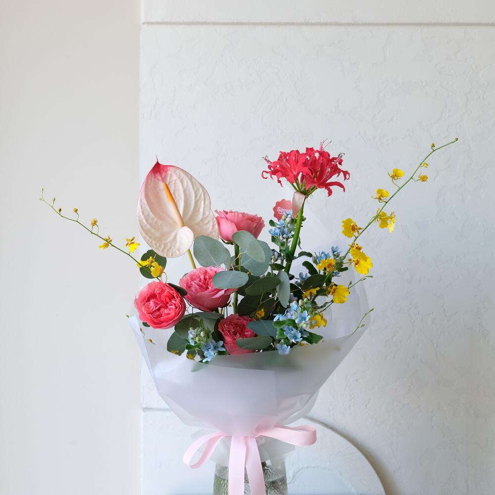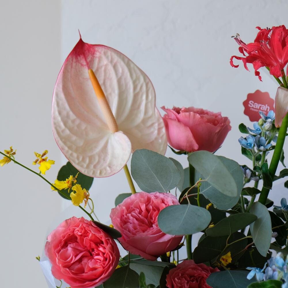 Anthurium - 1 pcs Peony - shaped rose - 4 pcs Nerina - 1 pcs The language of the input text is Russian, and it translates to "Tweedie" in English. - 4 pcs eucalyptus greens - 1 pcs oncidium - 2 pcs