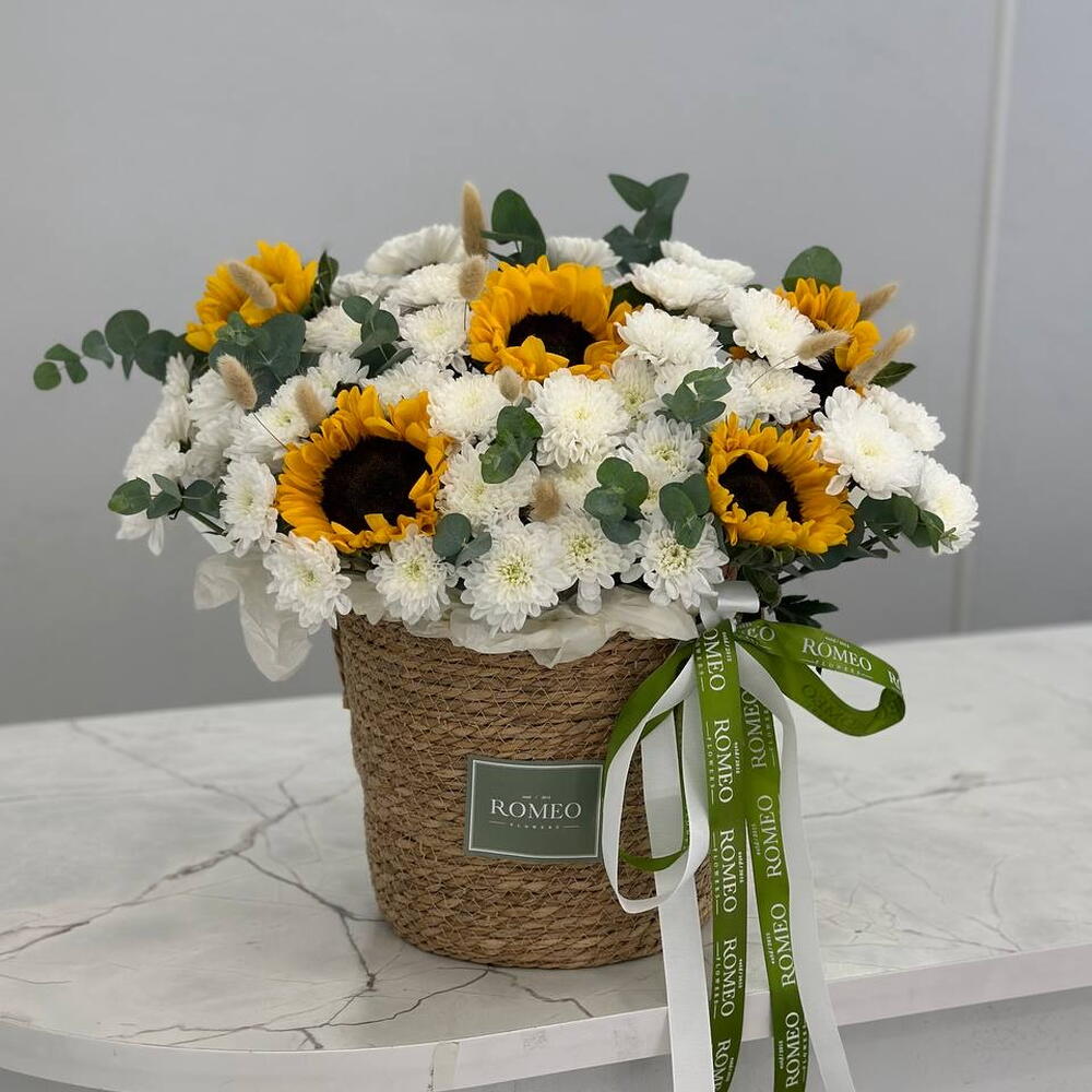 Данная композиция цветов представляет собой уникальный вариант подарка, мастерски выполненный из семи пышных кустовых хризантем, пяти солнечных подсолнухов, которые тают от нежности эвкалипта. А завершающую ноту оформления добавят десять стебельков невероятно изящного лагуруса. Все цветы органично собраны в стильную корзину, демонстрируя интересный симбиоз классики и современных акцентов. Благодаря своему великолепному дизайну, данная цветочная корзина станет идеальным решением для подарка на любое торжество или мероприятие.
