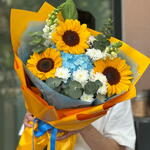 Snapdragon - 2 pcs Eucalyptus Baby Blue - 2 pcs Sunflower yellow - 3 pcs chrysanthemums bush - 2 pcs hydrangea 1 piece - 1 pcs