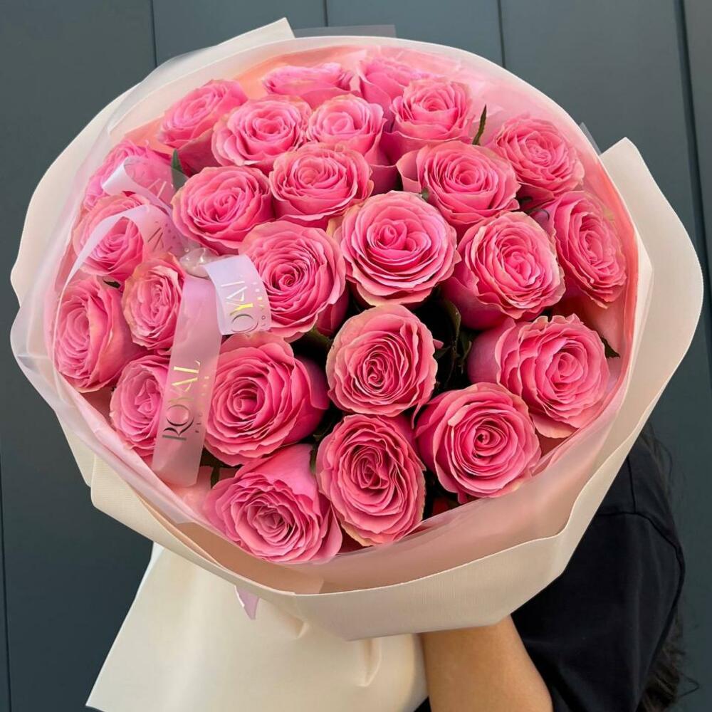 Элегантный и лаконичный букет из роз сорта Пинк Эксплорер — с глубоким, ровным розовым цветом и идеально уложенными лепестками. Он подойдёт для самых изысканных случаев: от романтических свиданий до деловых поздравлений.