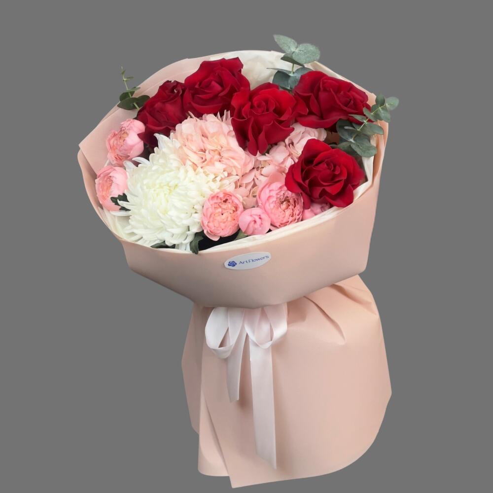 Hydrangea - 1 pcs Eucalyptus - 1 pcs Chrysanthemum one - headed - 1 pcs bush rose juliet - 2 pcs roses - 5 pcs aqua paper - 1 pcs