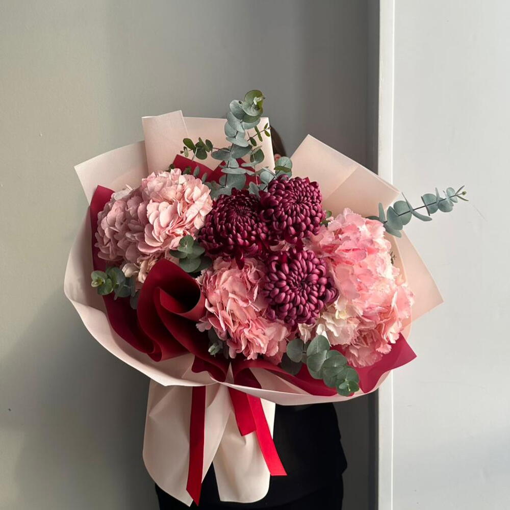 Hydrangea - 3 pcs Tape - 1 pcs Eucalyptus - 1 pcs Chrysanthemum one - headed - 3 pcs Decoration - 1 pcs
