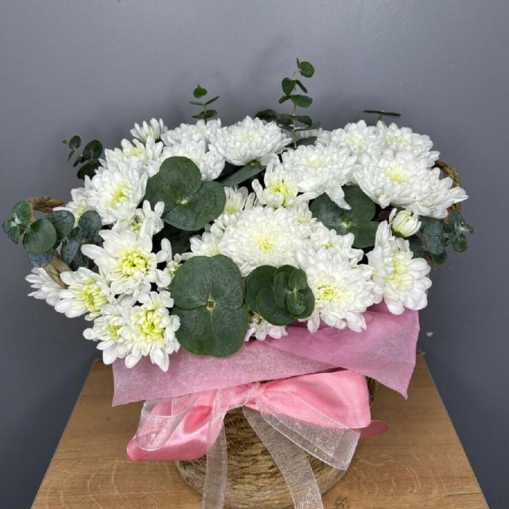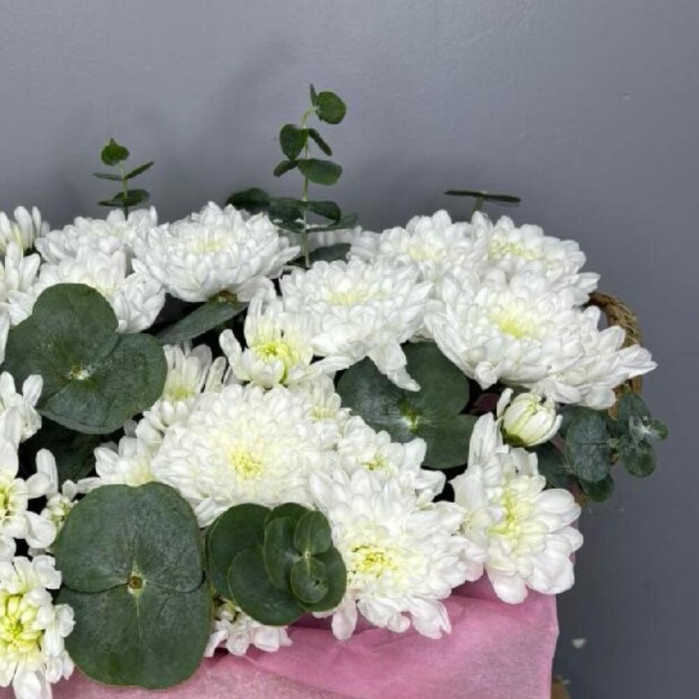 Белоснежная стойкая хризантема в стильном кашпо. Открытку положим в подарок 🎁