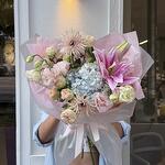 Hydrangea - 1 pcs Lily - 1 pcs Packaging - 3 pcs Eustoma - 3 pcs Gerbera - 2 pcs A postcard with your wishes - 1 pcs Spray rose - 2 pcs care instructions for the flowers - 1 pcs vitamins for flowers (crystal) - 1 pcs