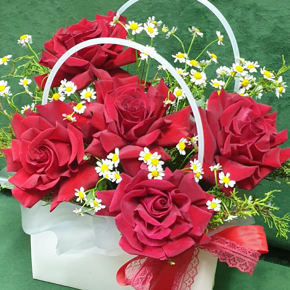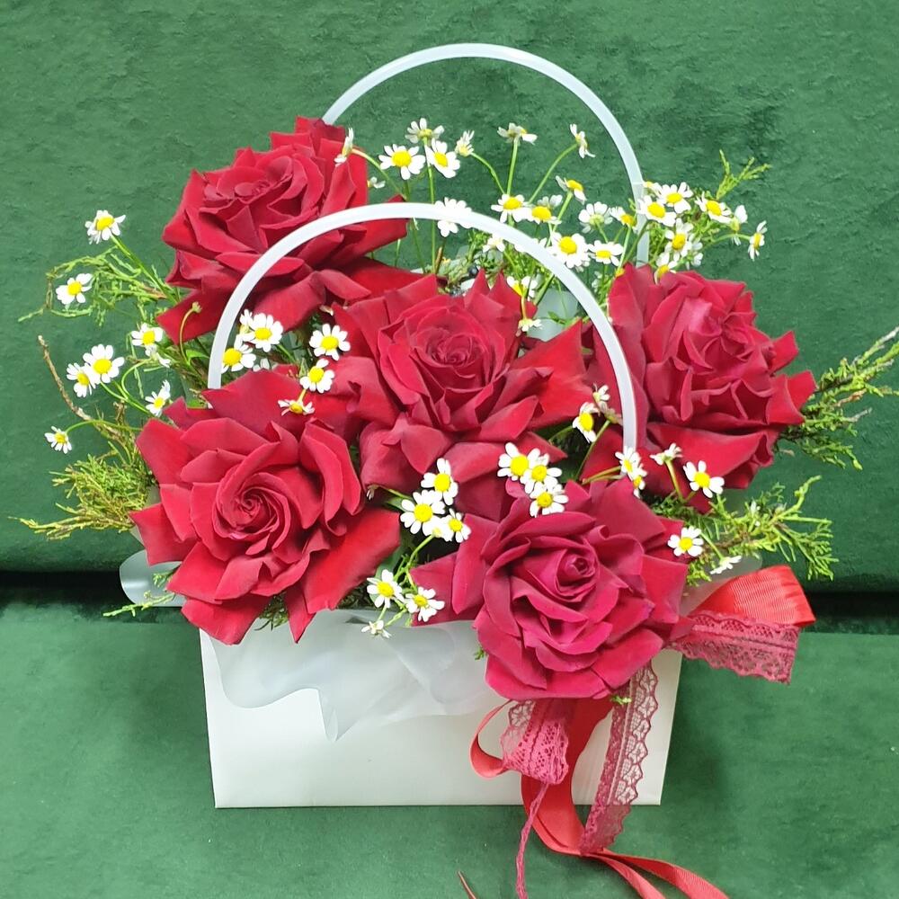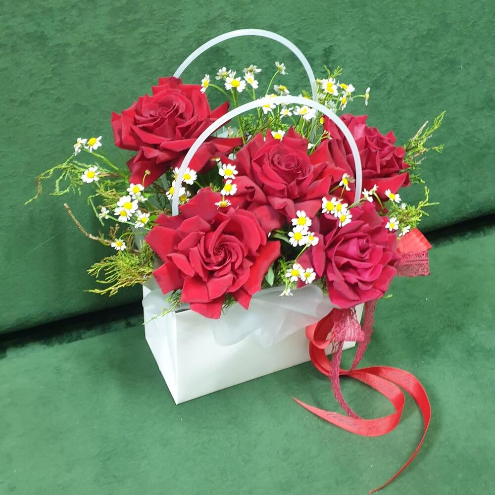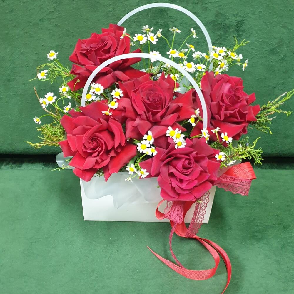 Tape - 2 pcs Oasis - 1 pcs Tanacetum camilla - 2 pcs Designer packaging - 1 pcs Handbag - 1 pcs Juniper - 2 pcs french roses are red - 5 pcs